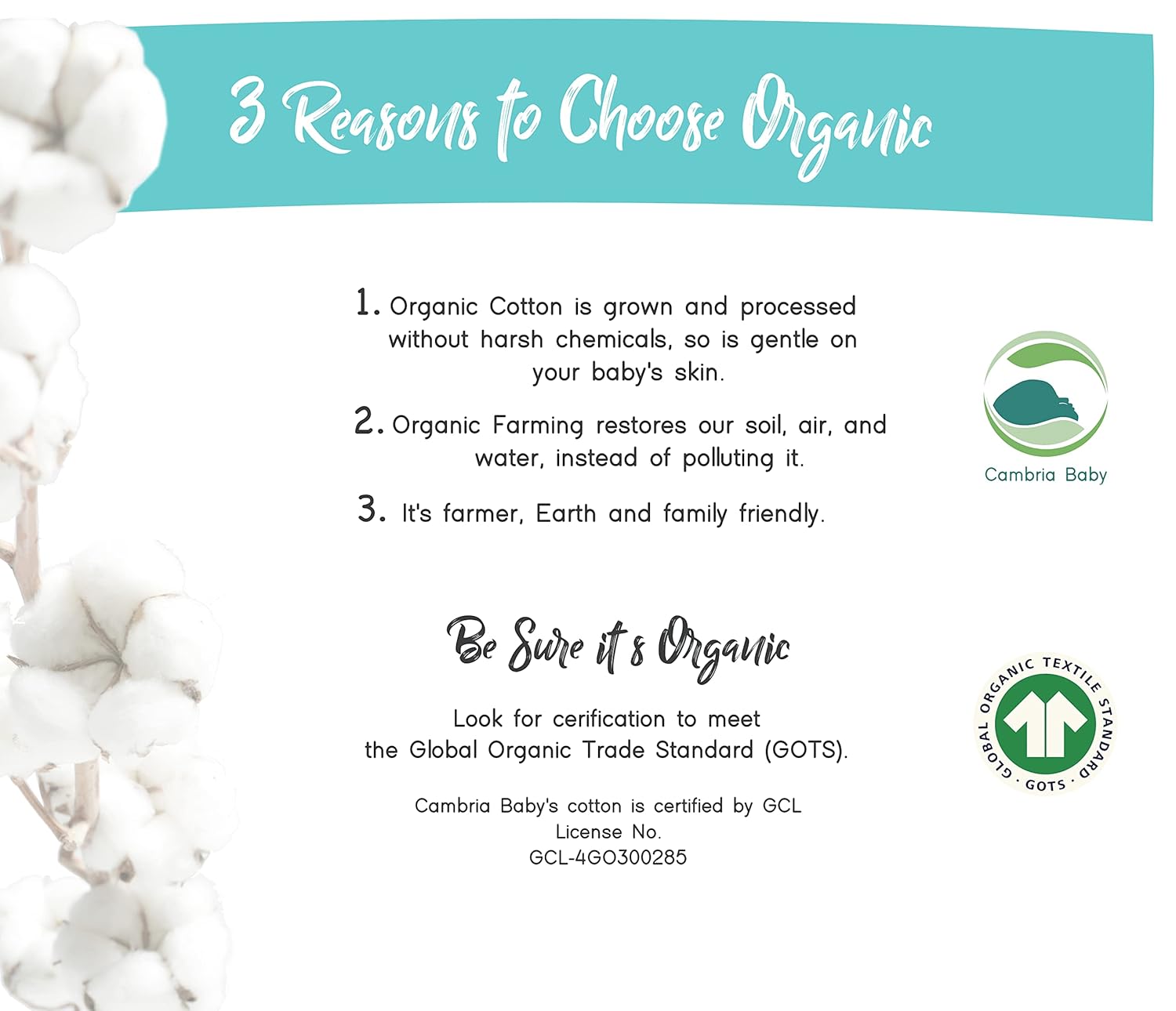 100% CERTIFIED ORGANIC COTTON. Cambria Baby’s products meet the Global Organic Textile Standard (GOTS). This ensures the organic cotton is meticulously farmed and manufactured to achieve the highest level of environmental and social responsibility.