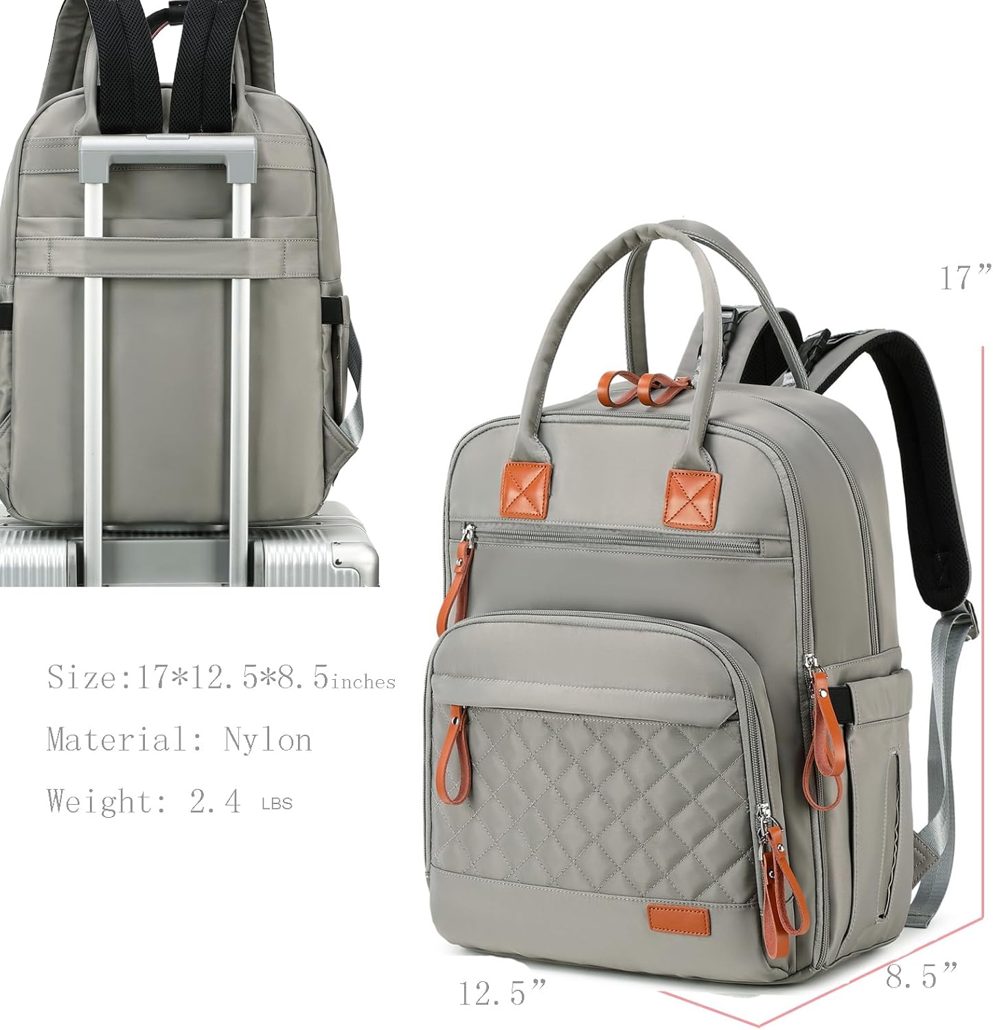 Large Capacity: Length : 12.5 inches, Width: 8.5 inches, Height: 17 inches, Total eighteen Pockets with plenty of room to carry your all items and mommy stuff: newborn bibs, cloth diapers, medicine, formula, 15.6 inches laptop and breast bump, perfect for travel