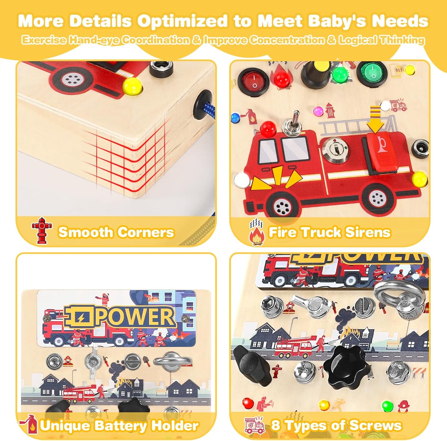 【Fire Truck Theme】: Our product integrates the functionalities of similar busy board & busy book for toddlers 1-3, creating a montessori busy board that is more suitable for kids. Revolutionizing with a fire truck-themed busy board, buttons emit horn sounds, and the fire truck section has 3 lights activated by toggle switches, plugs, and keys. More than just a wooden busy board, it helps teach practical life skills like using switches and keys. With diverse controls and rich lighting effects, this baby busy board enhances a baby’s fine motor skills.