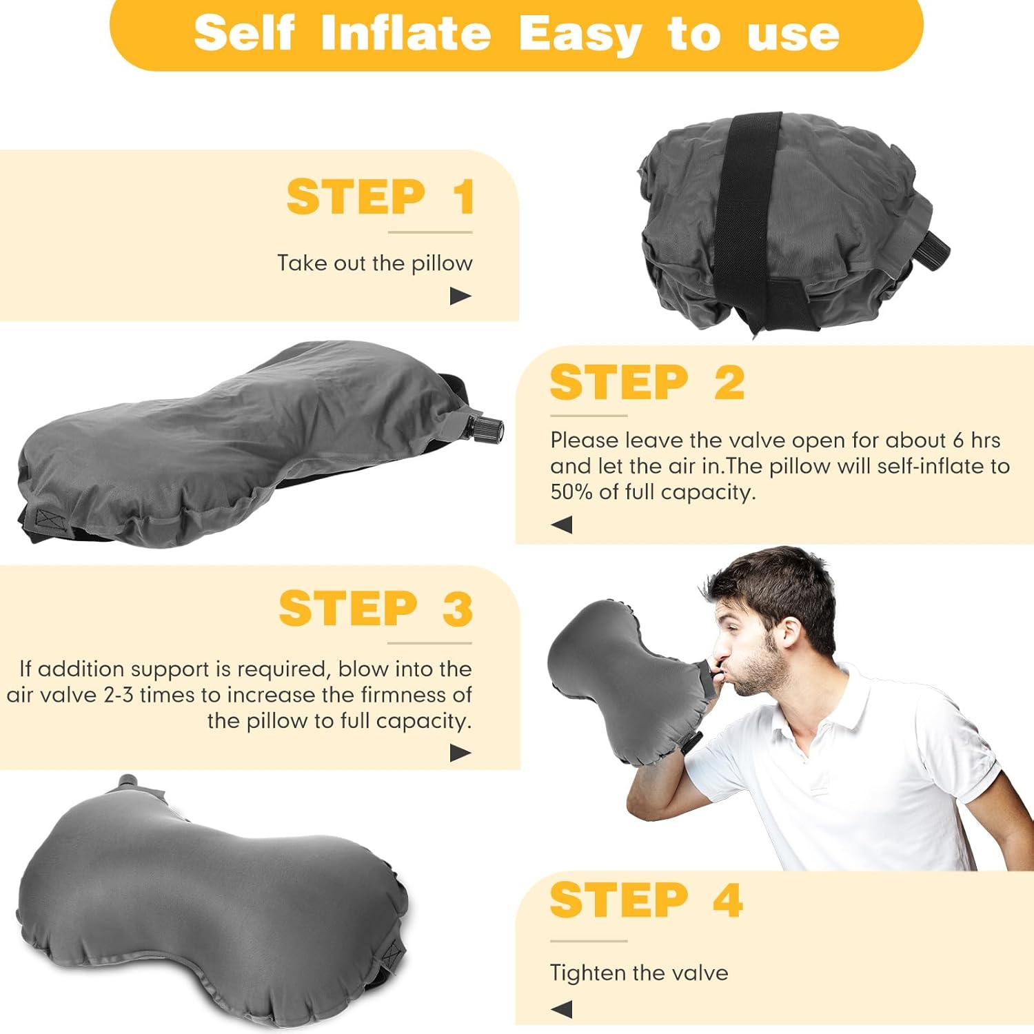 Self Inflate: our inflatable pillow for airplane travel are designed to self inflate to 50 percentage of full capacity; For additional support, simply blow into the air valve 2-3 times to increase the pillow’s firmness; Before first use, leave the air valve open for at least 6 hours to allow the compressed foam to expand fully and provide the maximum cushioning effect