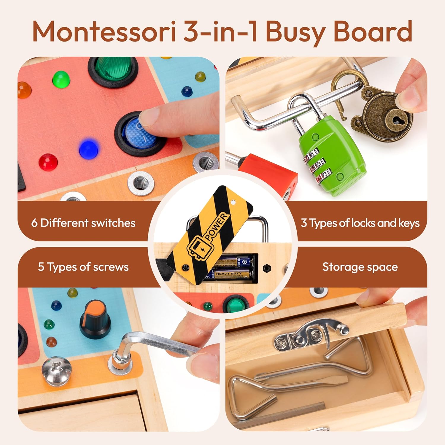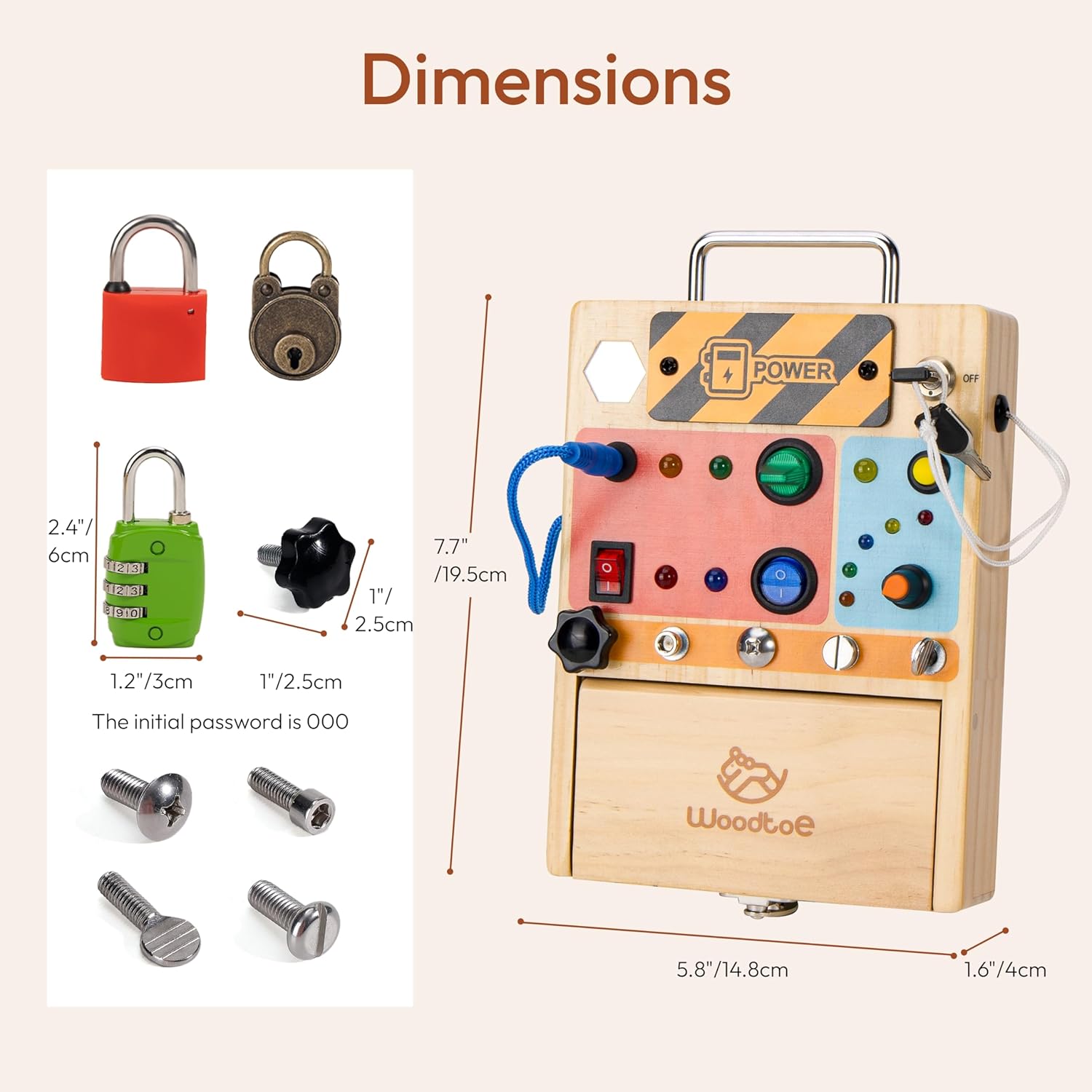 Rich Accessories: The sensory board includes 1 wooden box, 6 different switches, 10 LED lights, 5 screws of different shapes, 2 screwdriver tools, 3 unique locks and keys, and a product guide. The wooden busy board helps develop children’s hands-on abilities, hand-eye coordination, and fine motor skills. Not include AAA batteries! (Green lock code: 000)