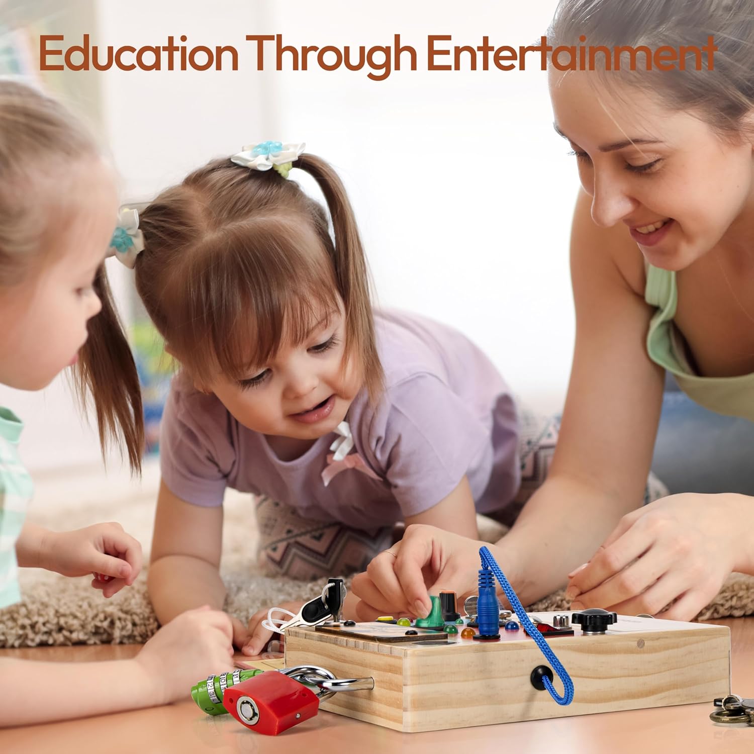 3-in-1 Busy Board: Compared to other products on the market, this Montessori busy board offers a multi-faceted game experience of switching light, screwing and unlocking. The wooden Montessori toy is designed with light switches of varying complexity, and each LED’s brightness is adjusted to be child-friendly, protecting their eyes during play. The screwdriver toy, along with the lock and key set, helps children develop life skills. These interactive features engage children more deeply, capturing their attention and keeping them away from electronic screens