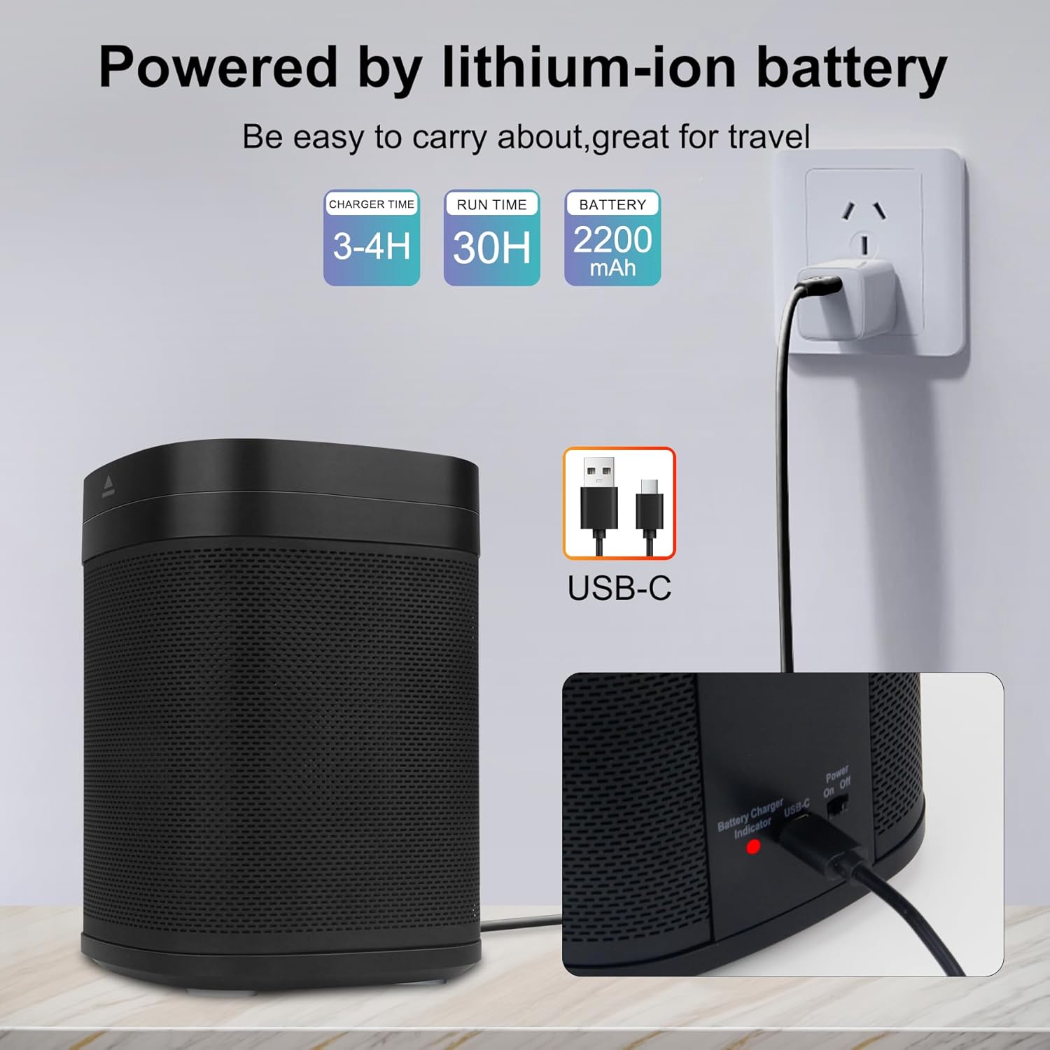[USB rechargeable Bluetooth speaker] : includes a non-removable 3.7V 2200mah lithium-ion battery (with Type-c fast charging interface). The complete charging time is about 3.5-4.5 hours. Depending on the 70 sounds provided for playback, the battery runs for about 45-50 hours at 50% volume after being fully charged, which is very convenient whether it is placed on the nightstand or carried around.