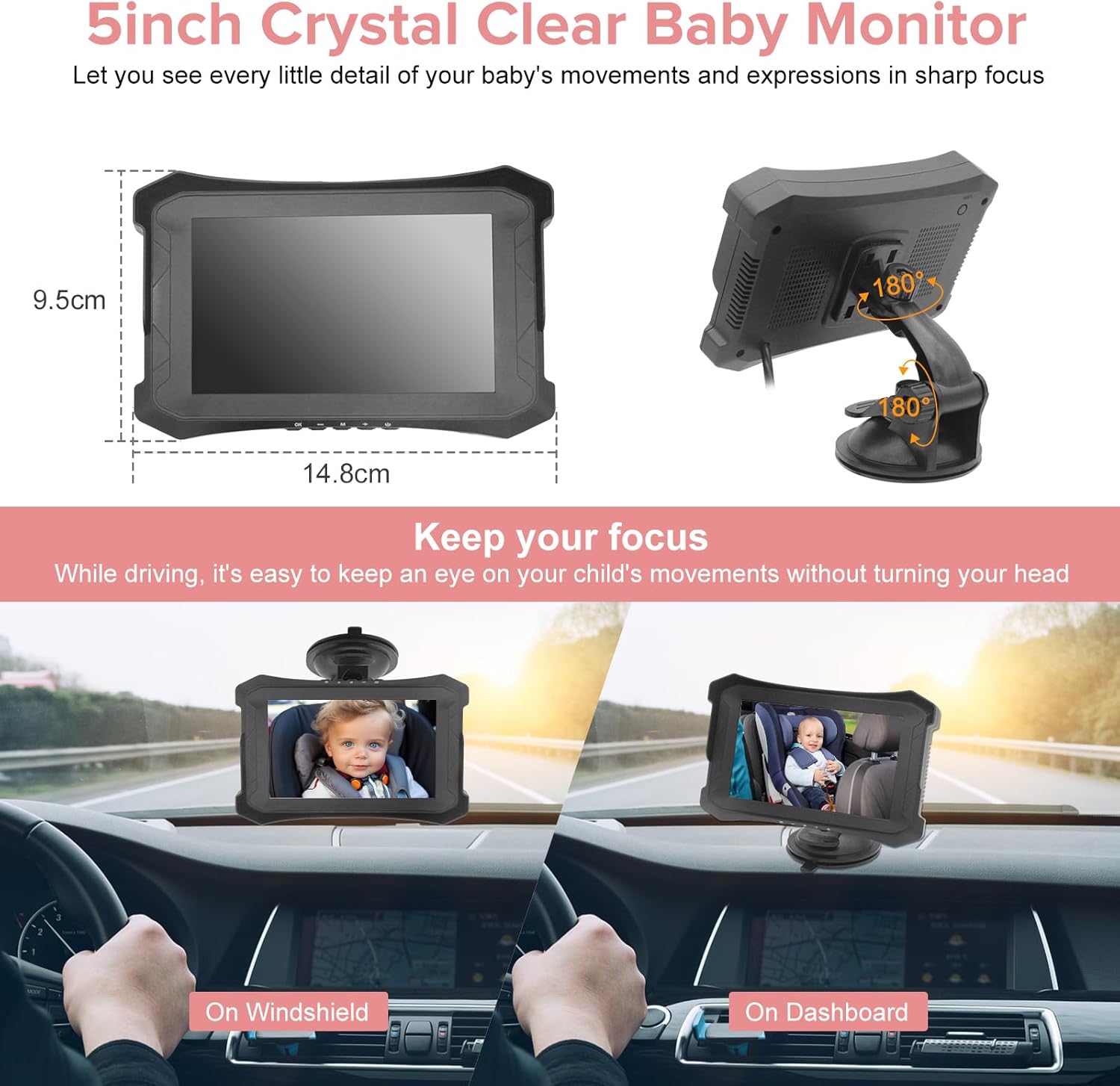 【Stable Car Baby Monitor for Safe Viewing】- A 5 inch HD monitor provides a clear and unobstructed view, keeping your focus on driving while monitoring your baby. The sturdy suction cup mount and anti-shake technology ensure the display stays firmly in place on the dashboard or windshield, even on bumpy roads, providing a steady and distraction-free view of your baby throughout the drive