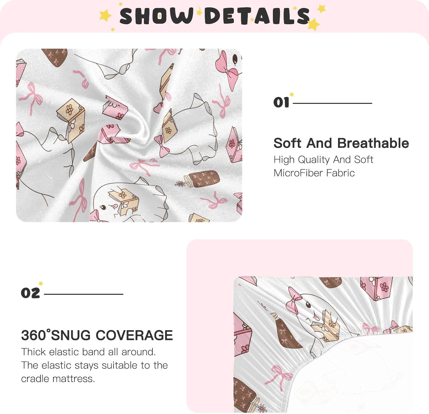 【Premium Material】:Gbjiemia crib sheets are made from high-quality imitation cotton modal, consisting of 95% polyester and 5% spandex. This blend ensures that our baby bassinet sheets are soft, breathable, and skin-friendly, providing optimal comfort for your little ones while they sleep or play