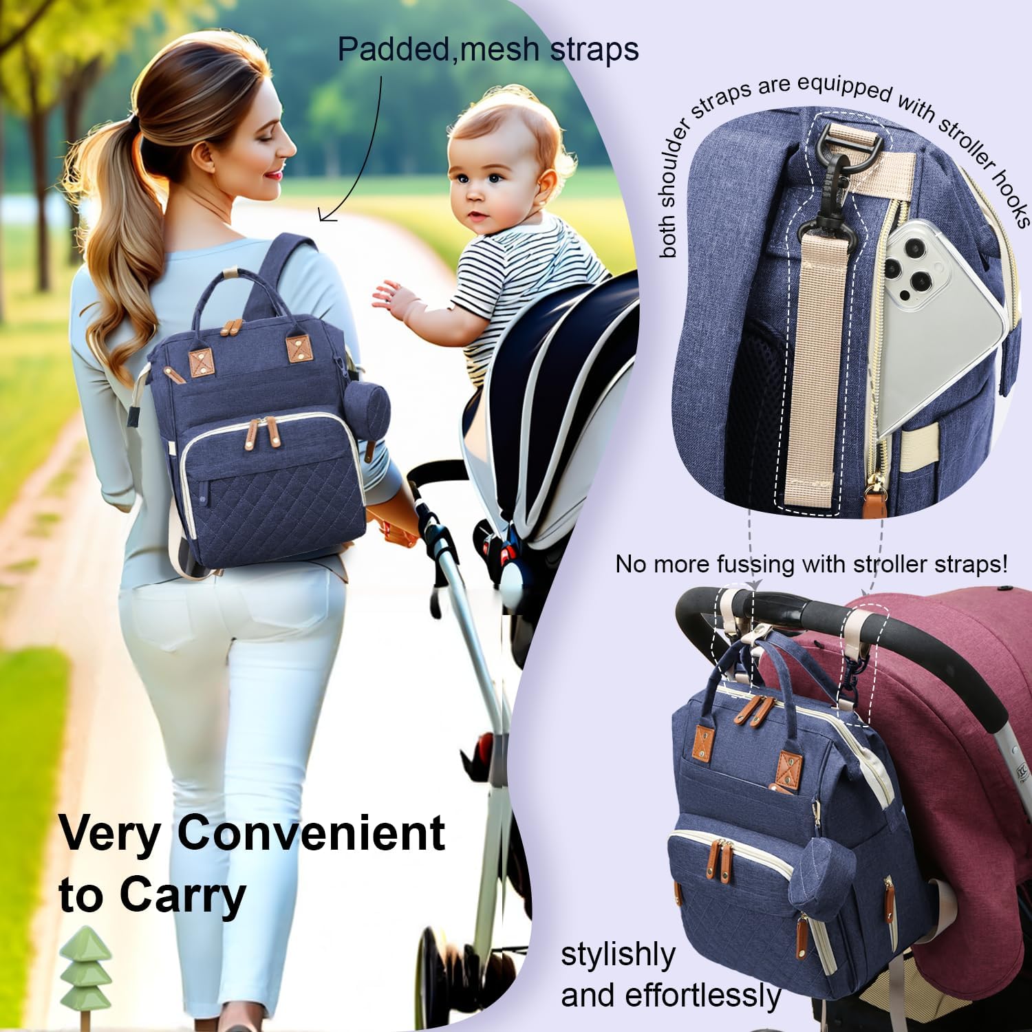 【Very Convenient to Carry】Our mommy bag is designed with multiple usage scenarios in mind. It can be used as a backpack, and the 3D honeycomb back with padded shoulder straps ensures that you won’t feel tired even after carrying it for a long time. Notably, both shoulder straps are equipped with stroller hooks, allowing you to travel effortlessly and stylishly. We also provide a very sturdy handle for easy and quick carrying.
