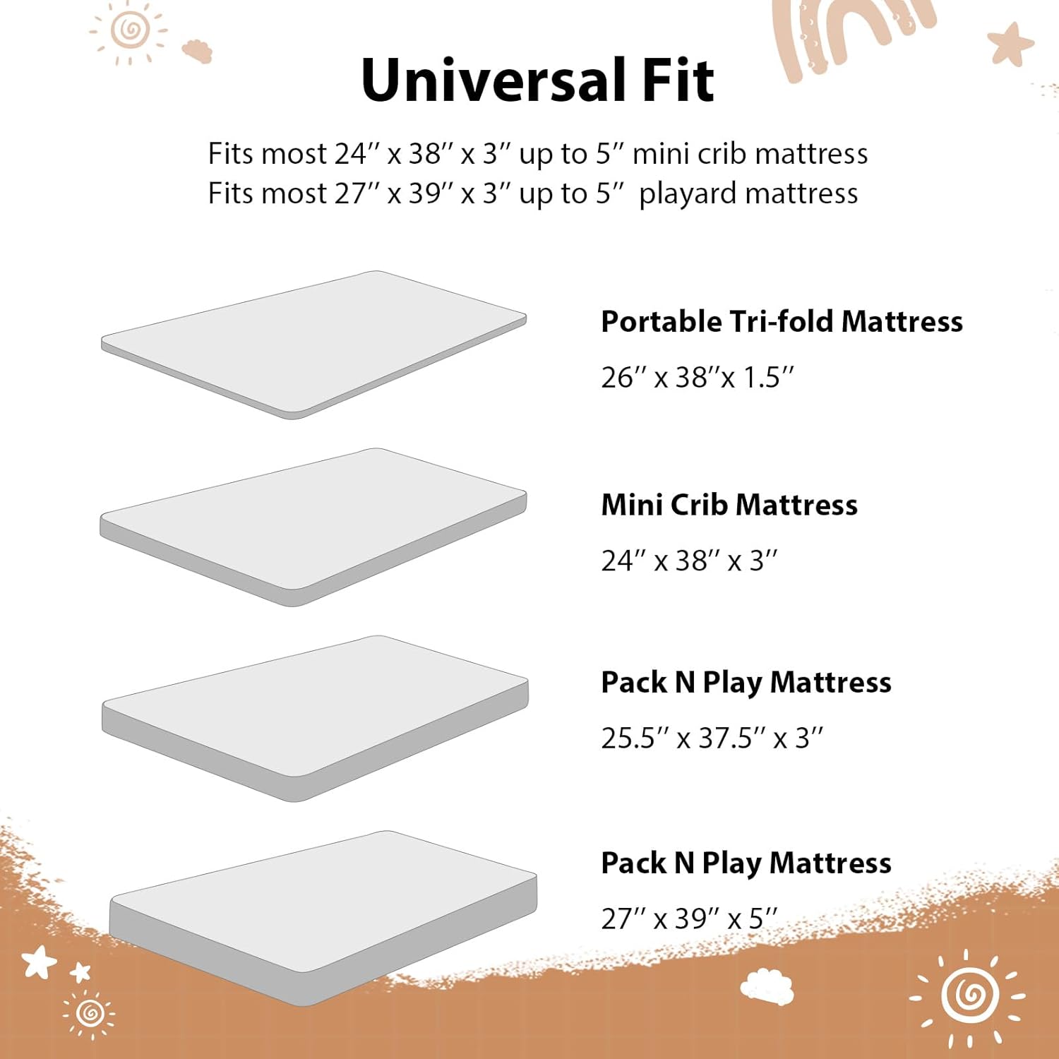 Snug Fit: Measuring 38” x 26”, our 3-pack mini crib sheets fit most baby portable plapens and pack n play mattresses. With elastic bands around the edges of the playard sheets, an 6-inch deep pocket, and stretchy fabric, they ensure a snug, wrinkle-free fit that stays securely in place.