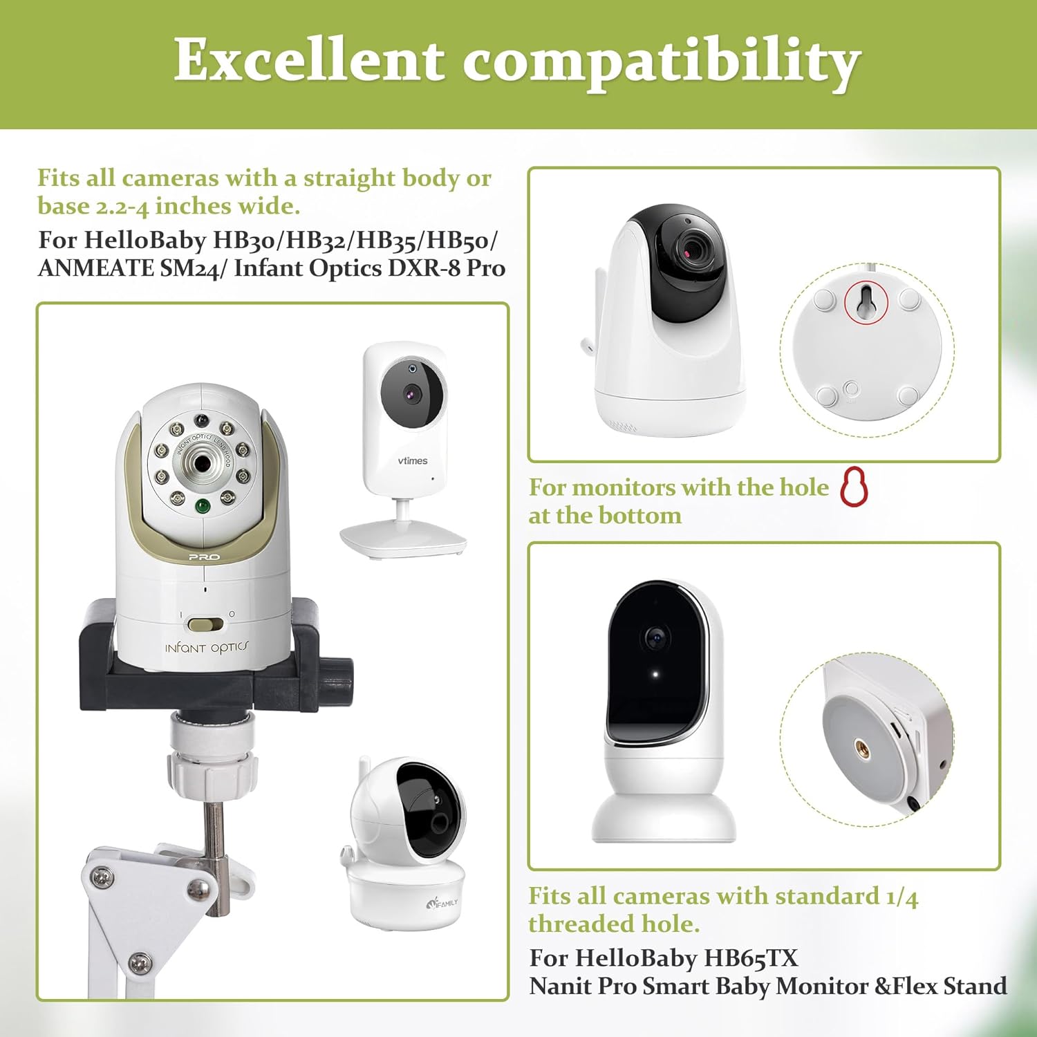 Fit for most Baby monitor Camera — Baby monitor floor stand compatible with HelloBaby HB30/HB32/HB35/HB50/ANMEATE SM24/HB65TX Nanit Pro/HB65TX HB30, Arlo,Motorola,Nanit Pro,Nanit Pro,Owlet,Infant Optics DXR-8 and DXR-8 Pro,Samsung ,DBPOWER,Anmade,babysense,summer Infant, VAVA, VA-IH006 / VA-IH009 / Hipp,Babysense HD S2, V43, and Max View,Vtech VM819/VM901/VM919HD,Ifamily,KASA,Owlet Cam 1, Arlo baby MBP33XL,Owlet Cam 2,Duo 2 Camera,Babysense HD S2,Babysense V43