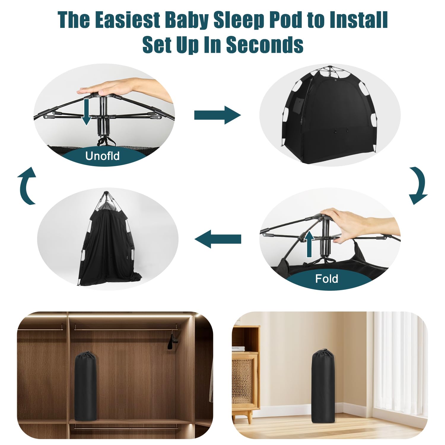 Easy 1-Click Setup & Portable: The sleep pod is incredibly easy to set up, requiring just a simple press of the top fastening mechanism. It opens in seconds, making it perfect for busy parents. The lightweight, foldable design allows for convenient travel and storage, and it comes with a carry bag for hassle-free portability.