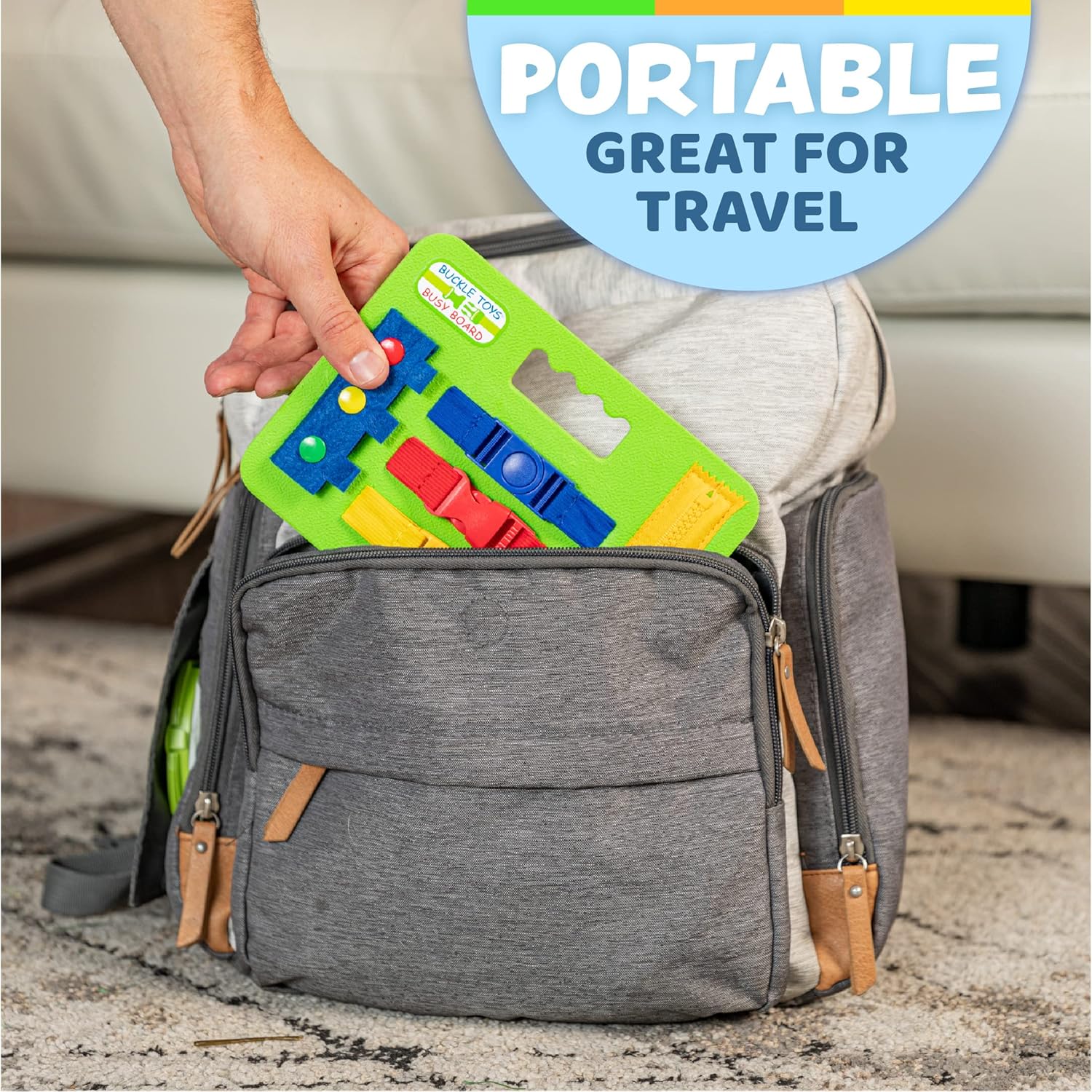 Foam Base: Buckle Toys Busy Boards are an original toy that provides quiet therapy through brain development tools. It’s made with lightweight foam & a built-in handle that’s just right for tiny hands to hold
