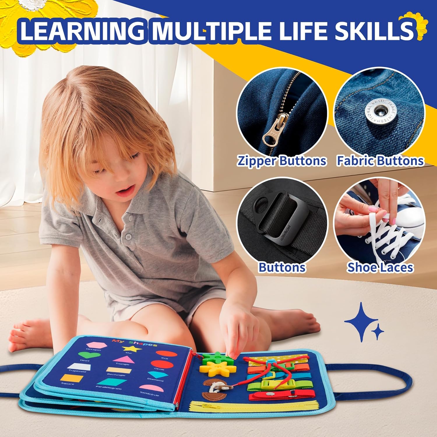 【8-in-1 Preschool Busy Book】Our montessori busy board has 8 pages to play with. Busy board incorporates various elements like sorting games and sensory stimuli. The educational toys for 3 year old offer over 30 learning activities for children to exercise, such as zipper, shoelaces, buttons, letter learning, shape matching, color matching, animal puzzles, clock and calendar learning, farm games, threading games, etc.