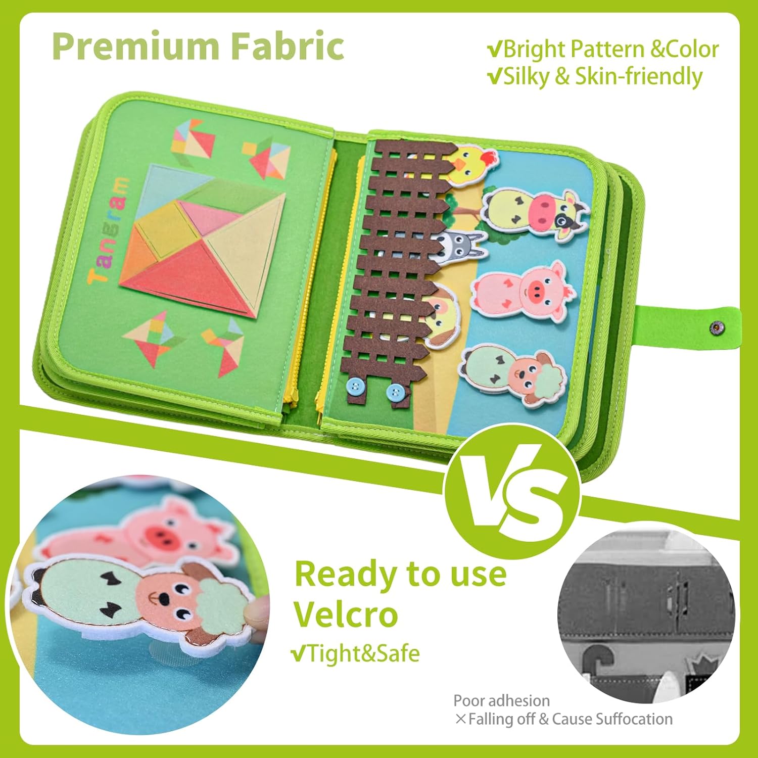 🎁𝐒𝐚𝐟𝐞 & 𝐃𝐮𝐫𝐚𝐛𝐥𝐞 𝐂𝐨𝐧𝐬𝐭𝐫𝐮𝐜𝐭𝐢𝐨𝐧: Crafted from high-quality, thickened fabric that’s soft yet highly durable, our Montessori board meets rigorous toy safety standards, ensuring free playtime. Each piece is securely integrated for added safety. It’s the ideal gift for toddlers aged 3+, ensuring both safety and longevity as they play and explore.