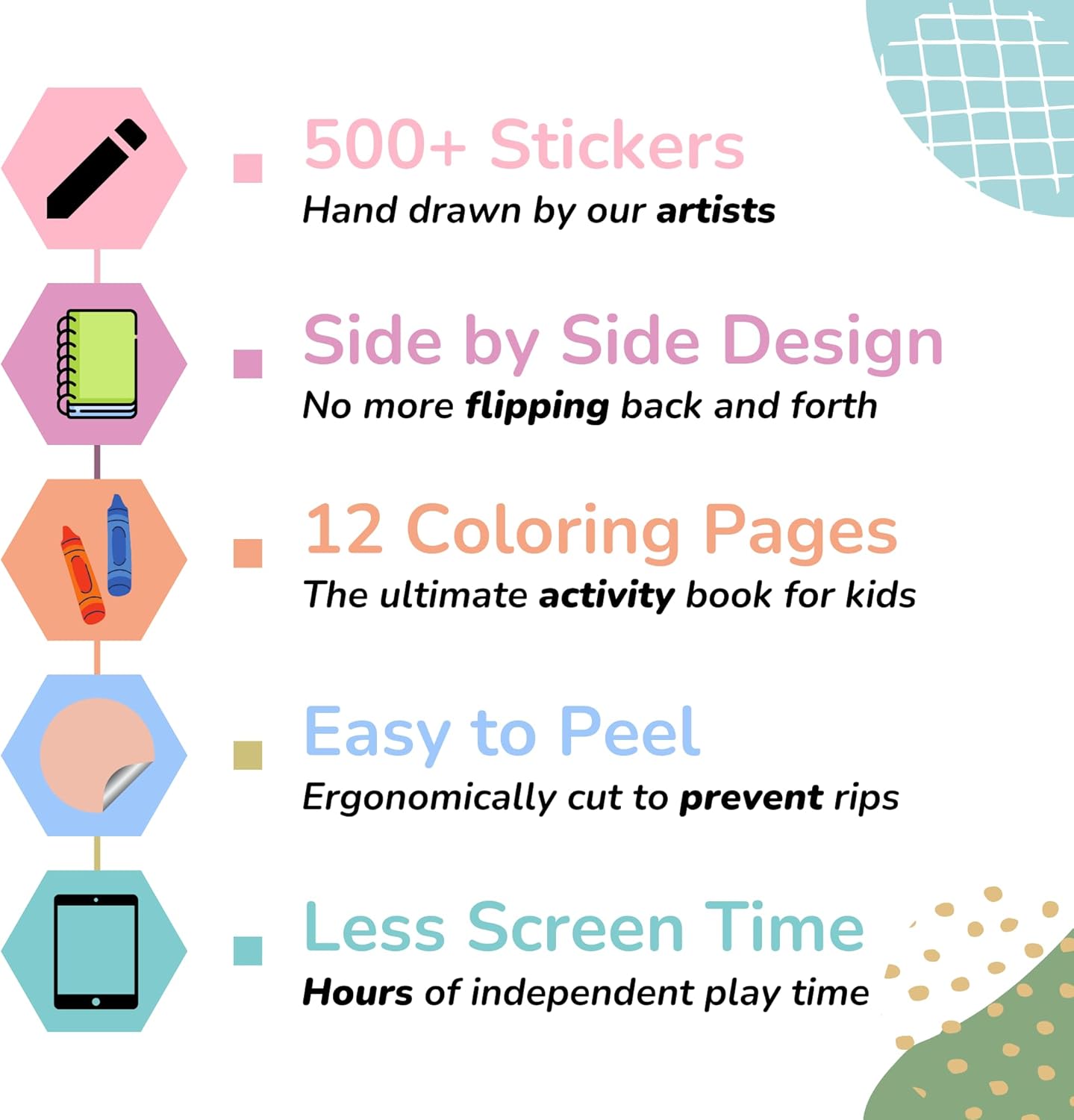 The original lay-flat sticker book: We created the side-by-side sticker pages & scenes with tiny hands in mind. The spiral binding allows for more time creating and less time flipping back and forth. Your kids will stay busy for hours crafting different scenes with these easy-to-peel stickers. Our spiral-bound sticker and coloring activity books are perfect for ages 2-4 and beyond!