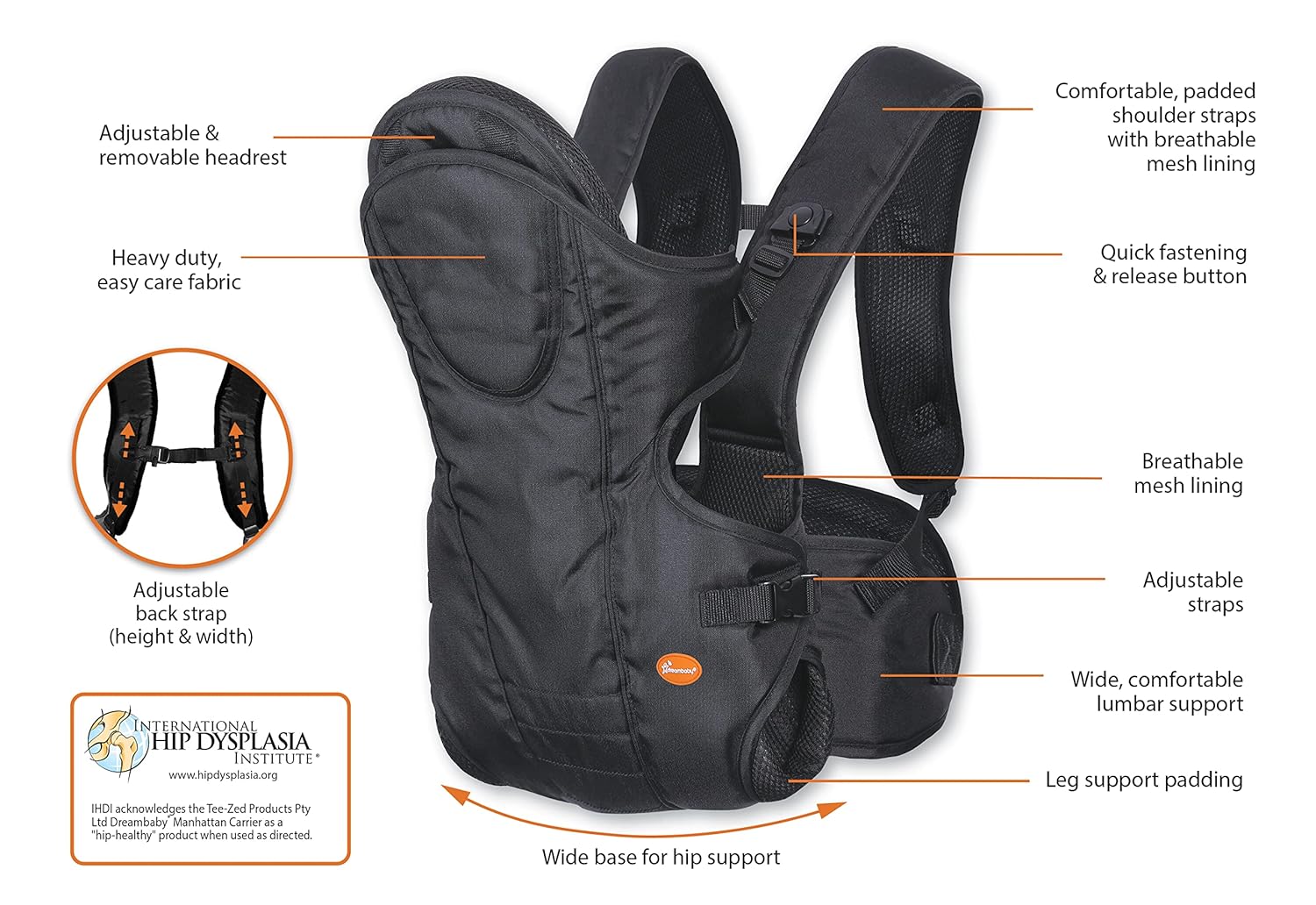 ADJUSTABLE – The Dreambaby Manhattan Carrier has adjustable straps for height and width making this a perfect option for most adults of all shapes, sizes, and heights