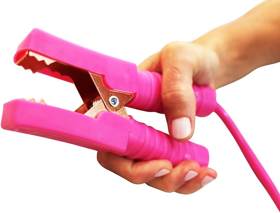 Pink and black heavy-gauge carry bag with reflective safety strip 12 ft. pink and black jumper cables Pink and black hand crank emergency flashlight Deluxe pink multi tool Pink emergency hammer Pink ice scraper Pink tire pressure gauge