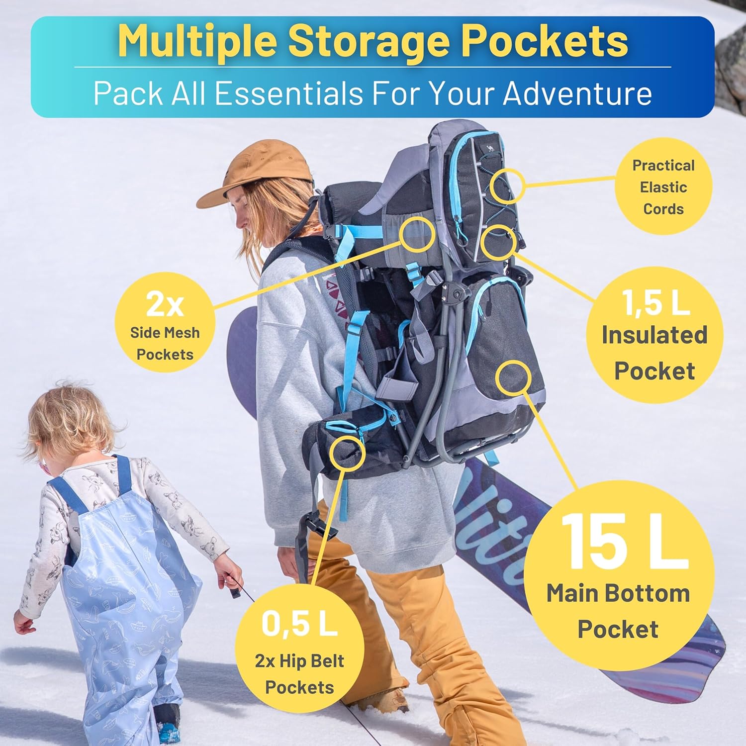 Be the first to review “Hiking Baby Carrier – Lightweight Child Carrier Backpack with Sun Shade & Rain Cover – Insulated Storage – Padded Comfort – Adjustable Fit & Safety Harness – Black/Blue”