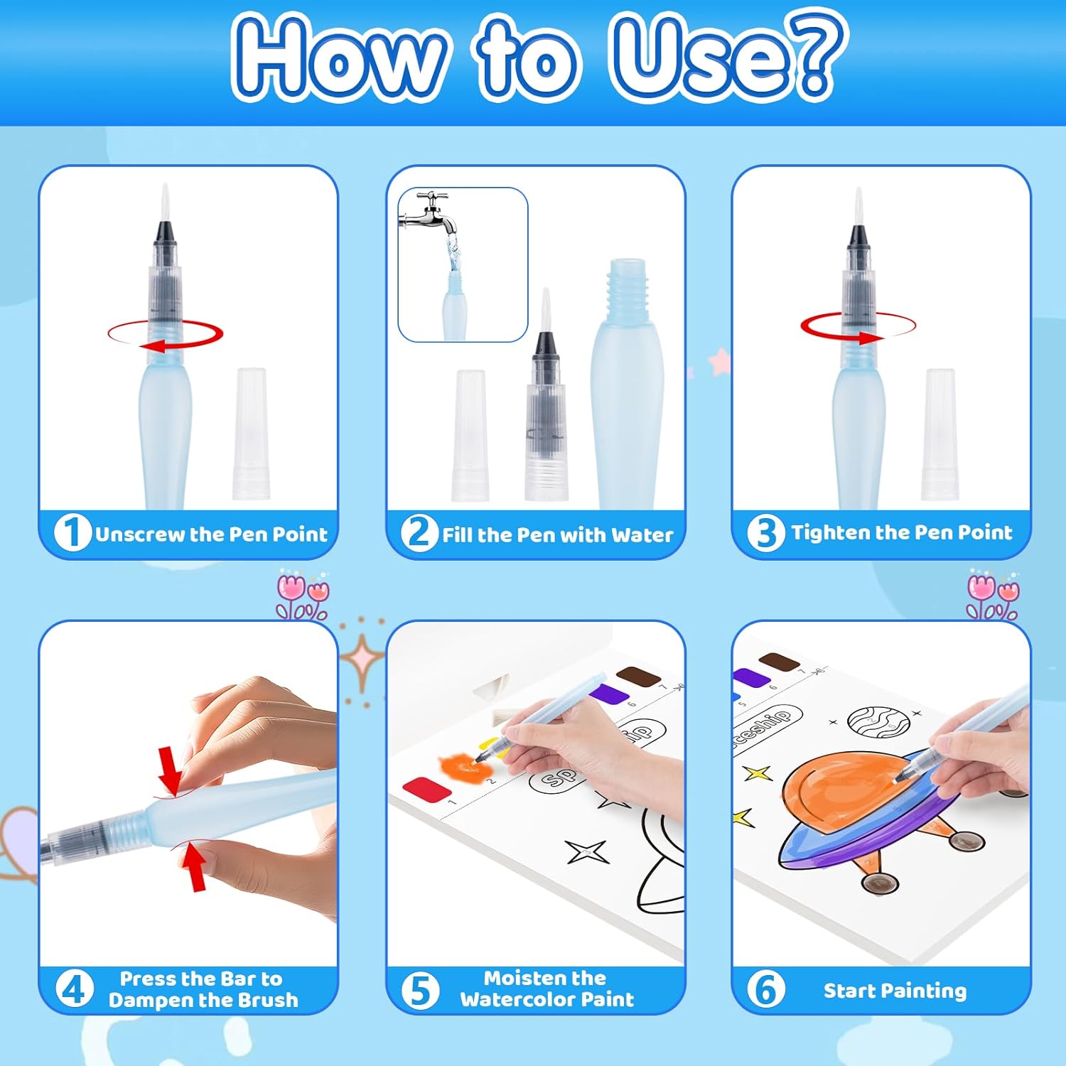 【Safety and Ease of Use】: Our primary consideration is safety of the water coloring book. The watercolor book is made from safe, eco-friendly, and reusable materials, ensuring a worry-free coloring experience. Simply fill the pen with water, dip it into the paint, and follow the color number prompts on the pattern to start creating. Children can enjoy hours of creative fun without any complications.