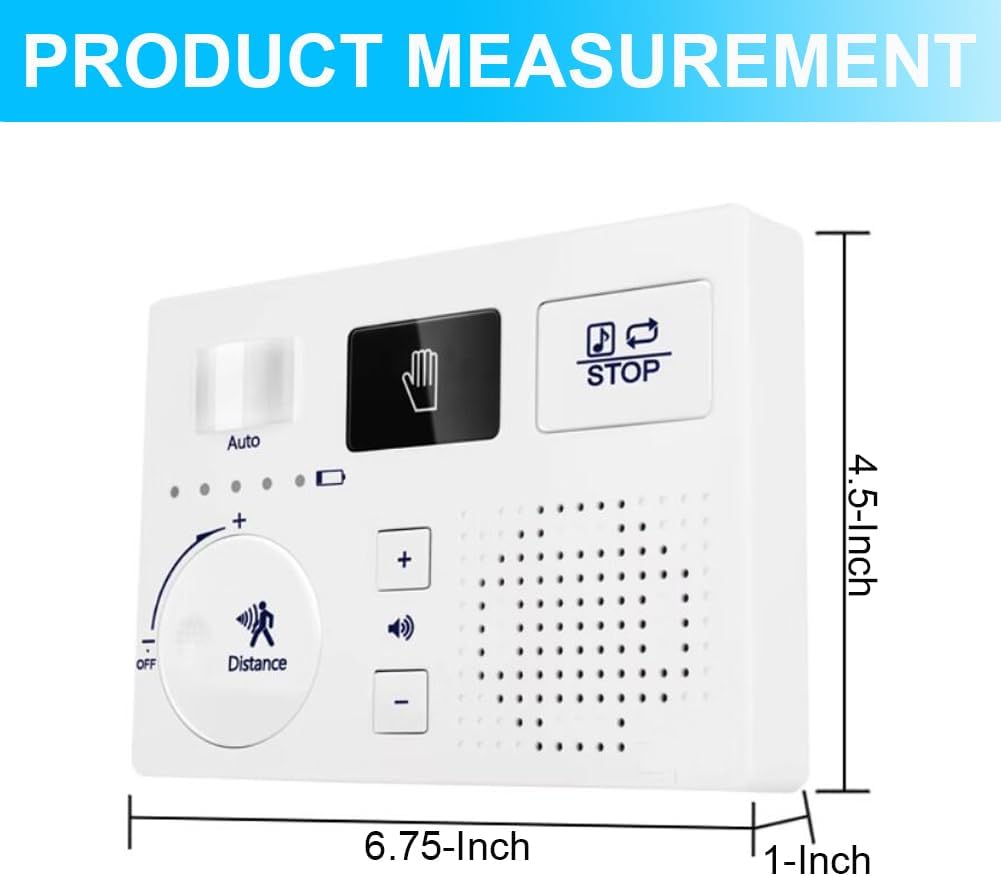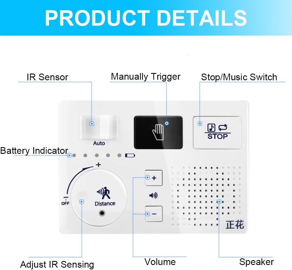 Product Size: 6.75 inches x 4.5 inches x 1 inch Powered by: AC100-240V power adapter+micro-USB cable(included) Optional Powered by batteries AA x 4pcs(Not Included) Sound adjustable: Yes, Max 120dB Activation mode: IR sensing and Handscreen Sound optional: water, water and bird sing, toilet flushing, music Sound time: 35s Extension sound support: Yes, TF card store up to 50 songs(TF card not included) External speaker port: Yes Battery indicator: LED lights IPx4 waterproof Yes Installation methods: Double-sided tape and screws mounting(included)