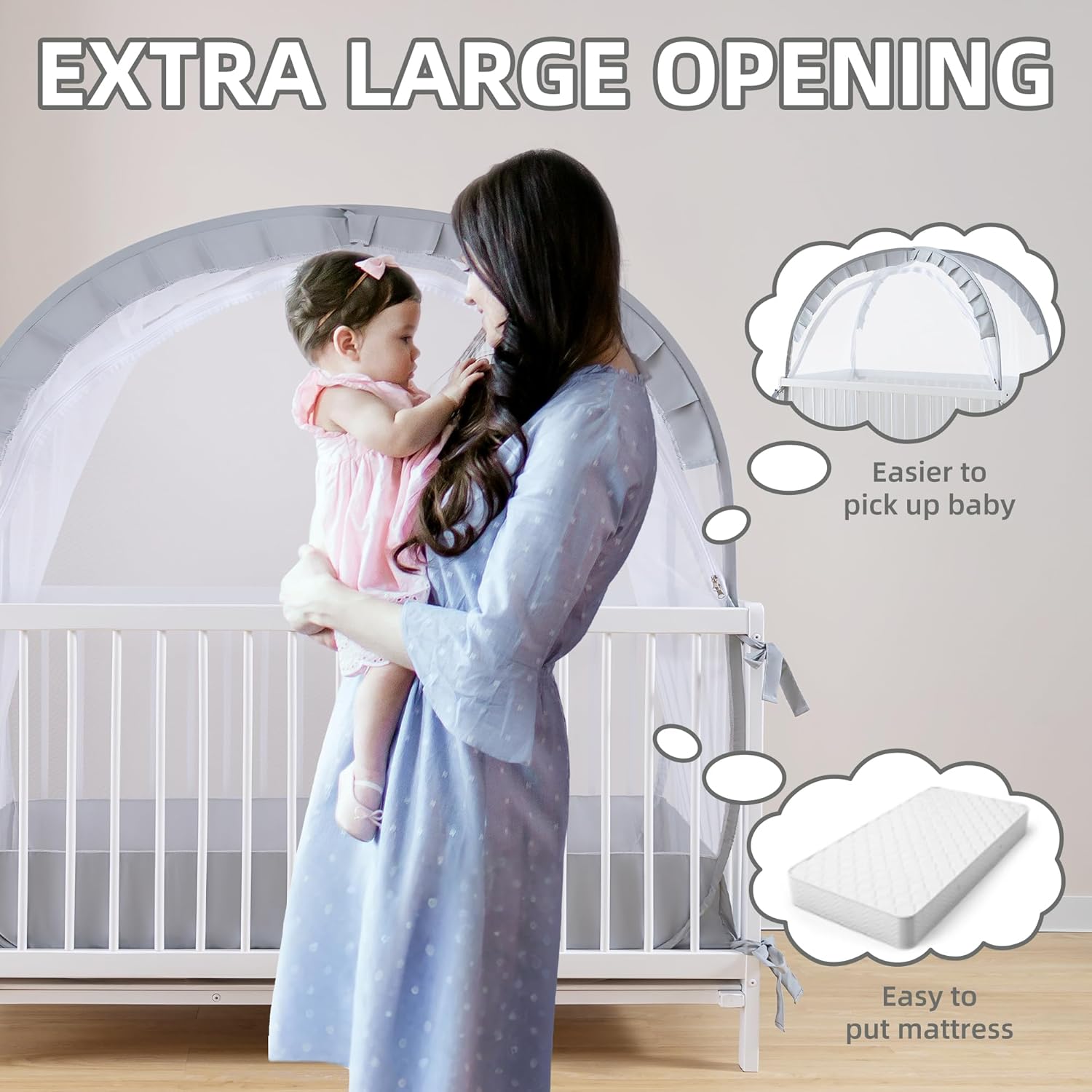 ❤️【Premium Material & Breathable Design】Crafted with durable premium material and 1200 holes/inch mesh, this crib tent ensures optimal air circulation, keeping baby comfortable and cool.