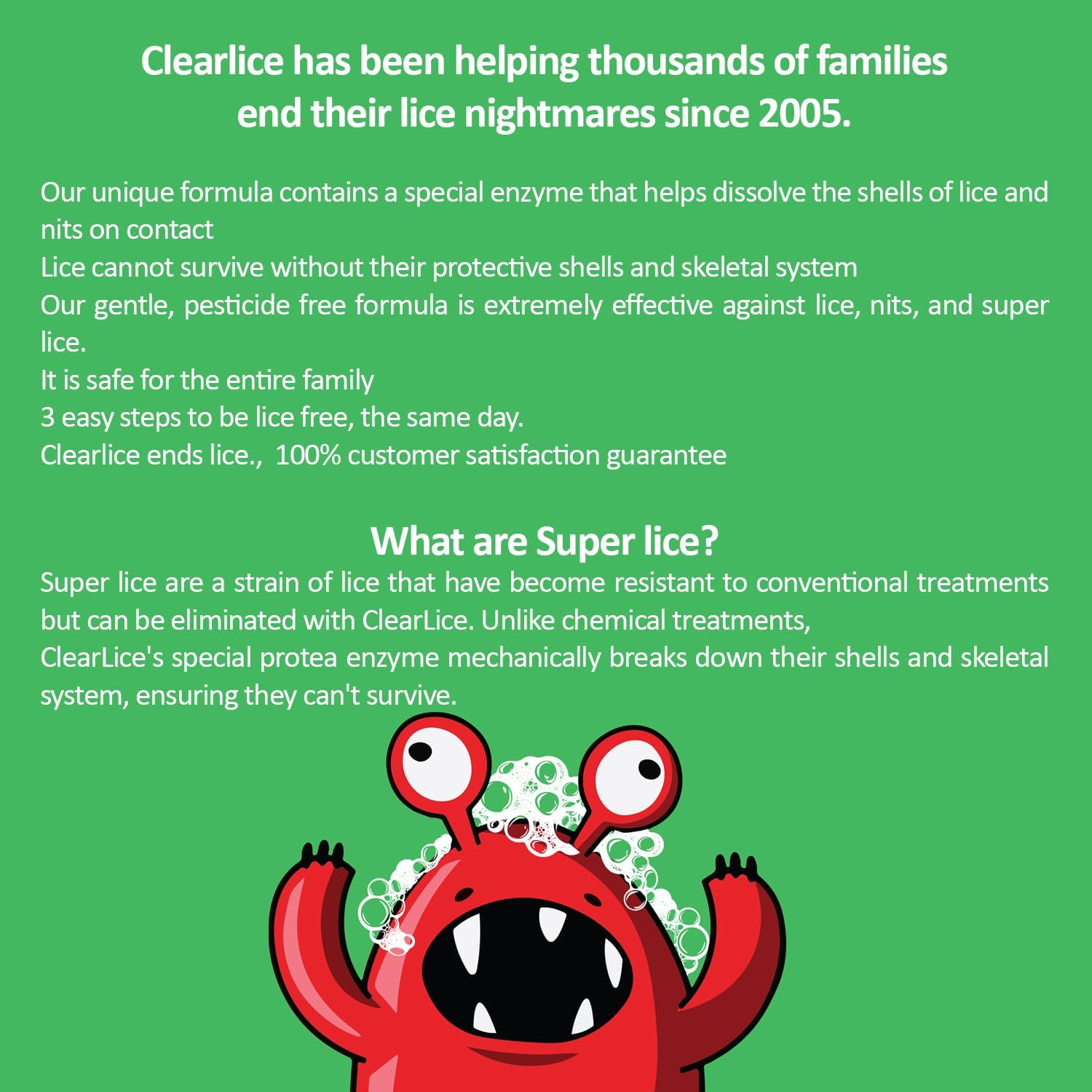 Our lice treatment extra strength family formula is proven to work on even the most stubborn super lice. With Clearlice, you can eliminate lice infestations in just one hour, saving time, money, and frustration. End lice naturally and effectively today! Click “Add to Cart” now to get your Clearlice Lice Treatment Kit and experience the relief of a lice-free home in just one hour.