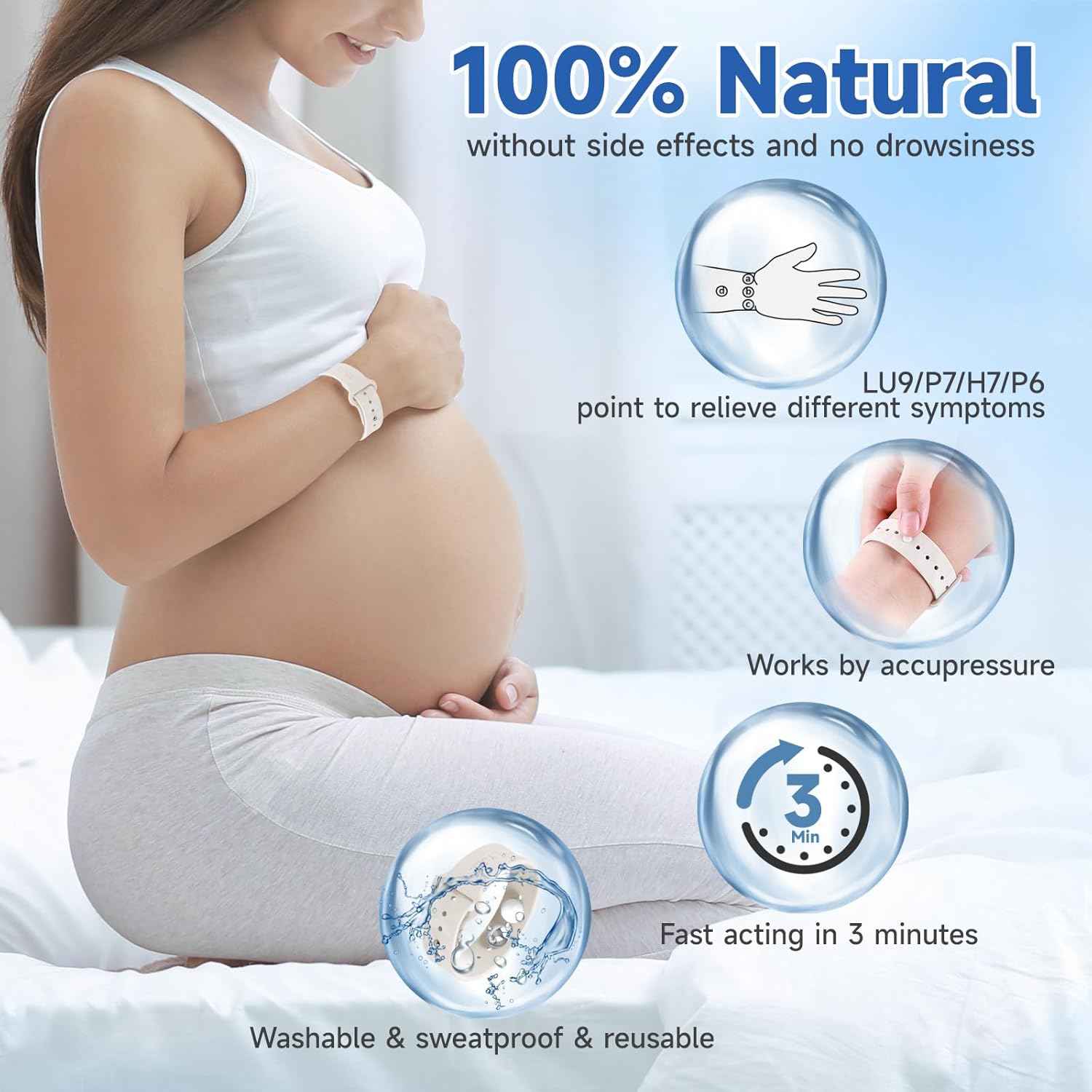 【NATURAL NAUSEA RELIEF】: LYJEE Nausea Bands are clinically tested and recommended by healthcare experts. LYJEE Motion Sickness Bands works by stimulating four different pressure points (H7/P7/LU9/P6) on your wrist to relieve different symptoms. Such as motion sickness,morning sickness ,symptoms, anxiety, insomnia, stress, headache, nausea and palpitations.(For pressure point locations please view product instruction manual.)