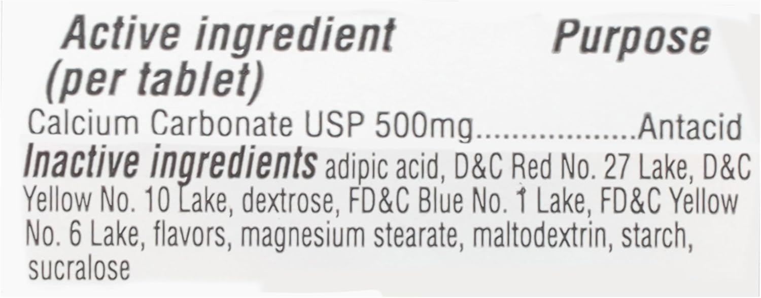 ACTIVE INGREDIENT: Each chewable tablet contains 500 mg of calcium carbonate, an antacid that helps relieve heartburn and indigestion.