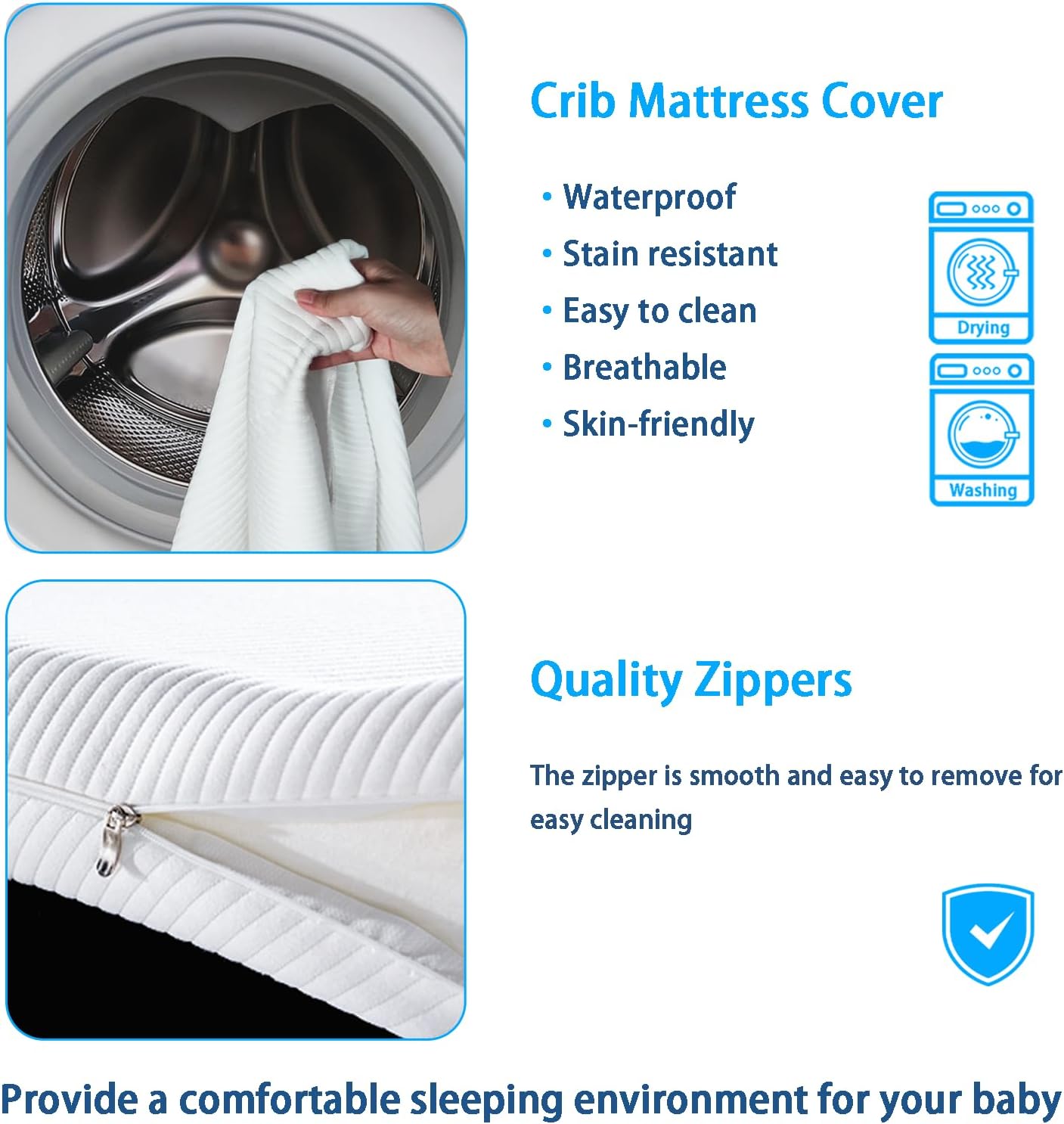 【EASY TO CLEAN ZIPPER DESIGN】Toddler mattress cover with a zipper design, which is easy to detachable for daily cleansing in case of accidents, simply unzip, remove and put it in the washing machine can be cleaned, so you never have to worry about accidents and keeping your mattress clean