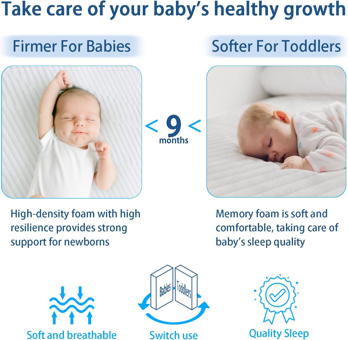 One Side: The 1-inch 40D memory foam, which is soft and comfortable, is suitable for infants over 9 months old.The other side: The 30D high-density foam with high rebound, offers strong support for newborns aged 0-9 months.It also provides protection from injury for babies who are learning to walk.