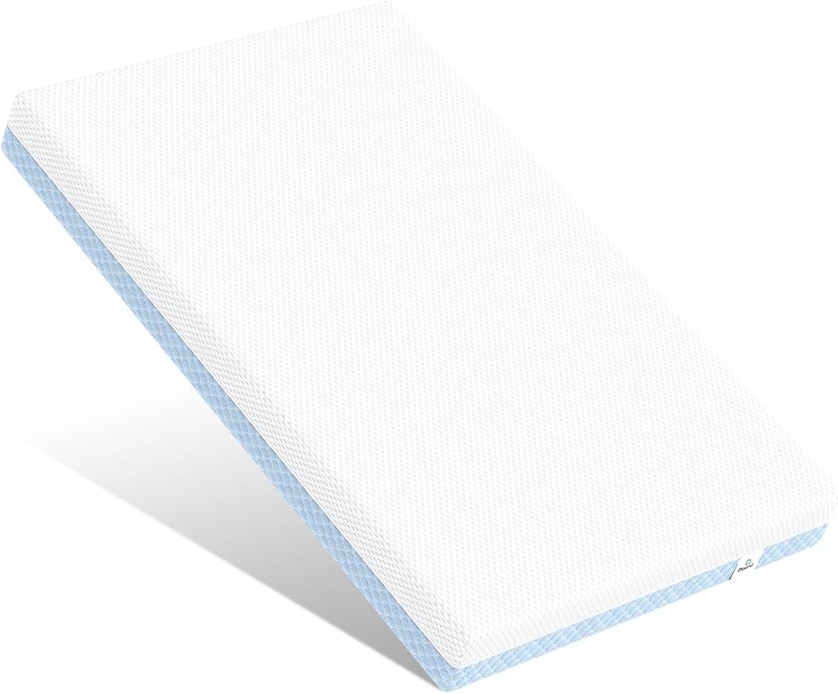 【Dual-Firmness Design】: The Dourxi mini crib mattress provides dual firmness to accommodate both infants and toddlers. Featuring gel-lnfused memory foam on one side for a refreshing and comfortable sleep for your toddler, and high-density support foam on the other side to provide the essential support needed for your newborn. Tailored Support and Comfort for Every Stage of Your Baby’s Growth.