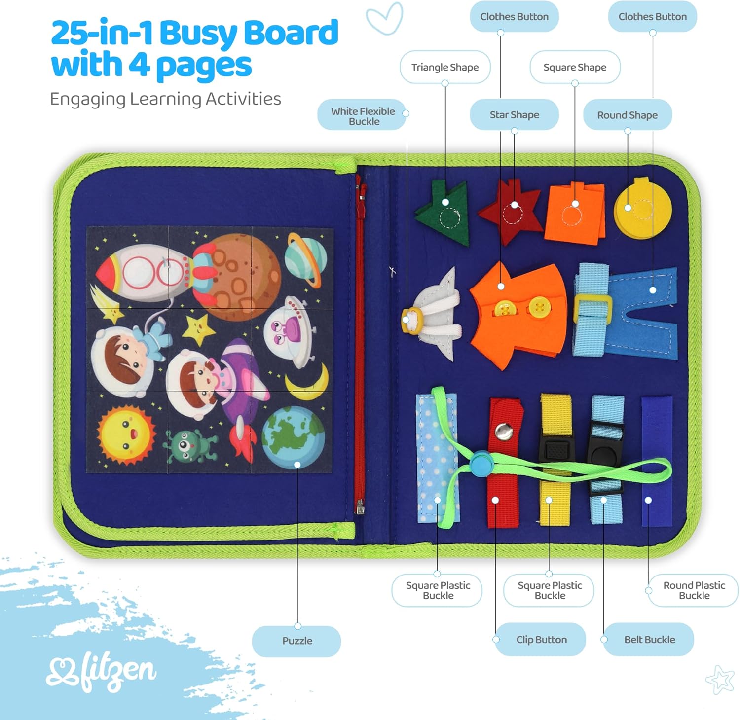 🛡️ SAFE EDUCATIONAL TOY: Crafted from soft, high-quality felt fabric and non-toxic material, Fitzen’s Blue Busy Board is designed with your child’s safety in mind. With its engaging activities and durable construction, you can trust that your child is playing with a safe and educational product.