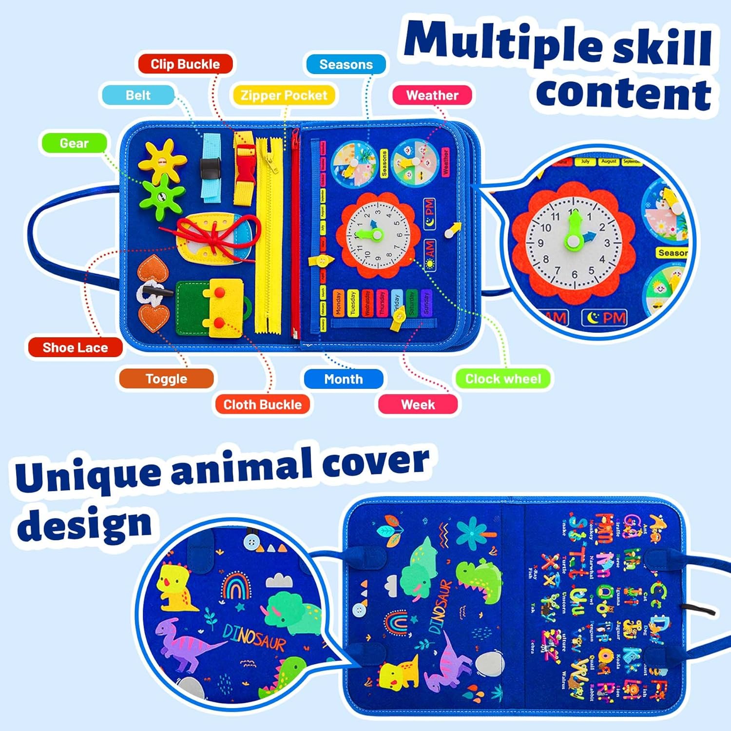 8 Pages in 1 Montessori Busy Board: Our upgraded busy board features 8 interactive pages, offering over 30 different learning activities for toddlers. From zippers, shoelaces, and buttons to alphabet learning, shape matching, and clock & calendar education, this board provides endless opportunities for skill development