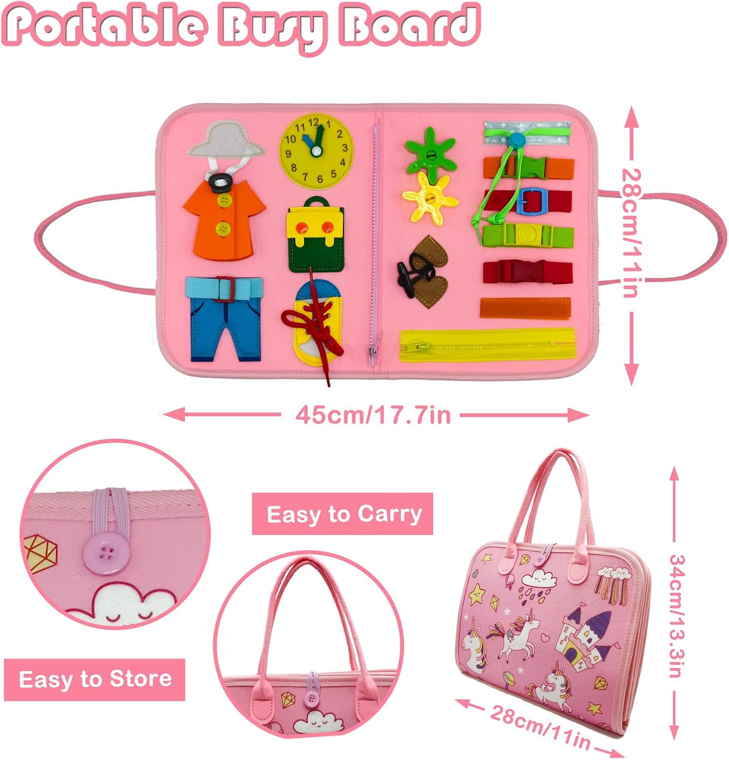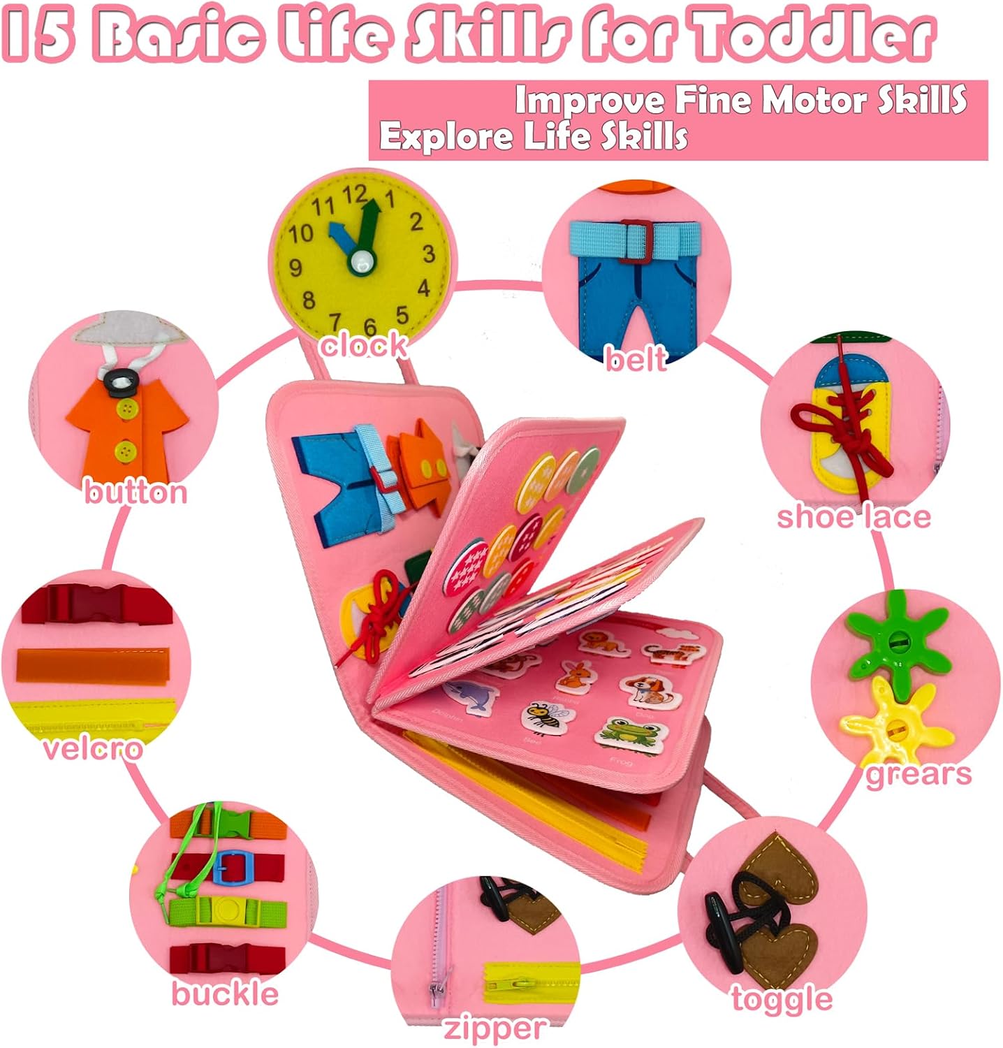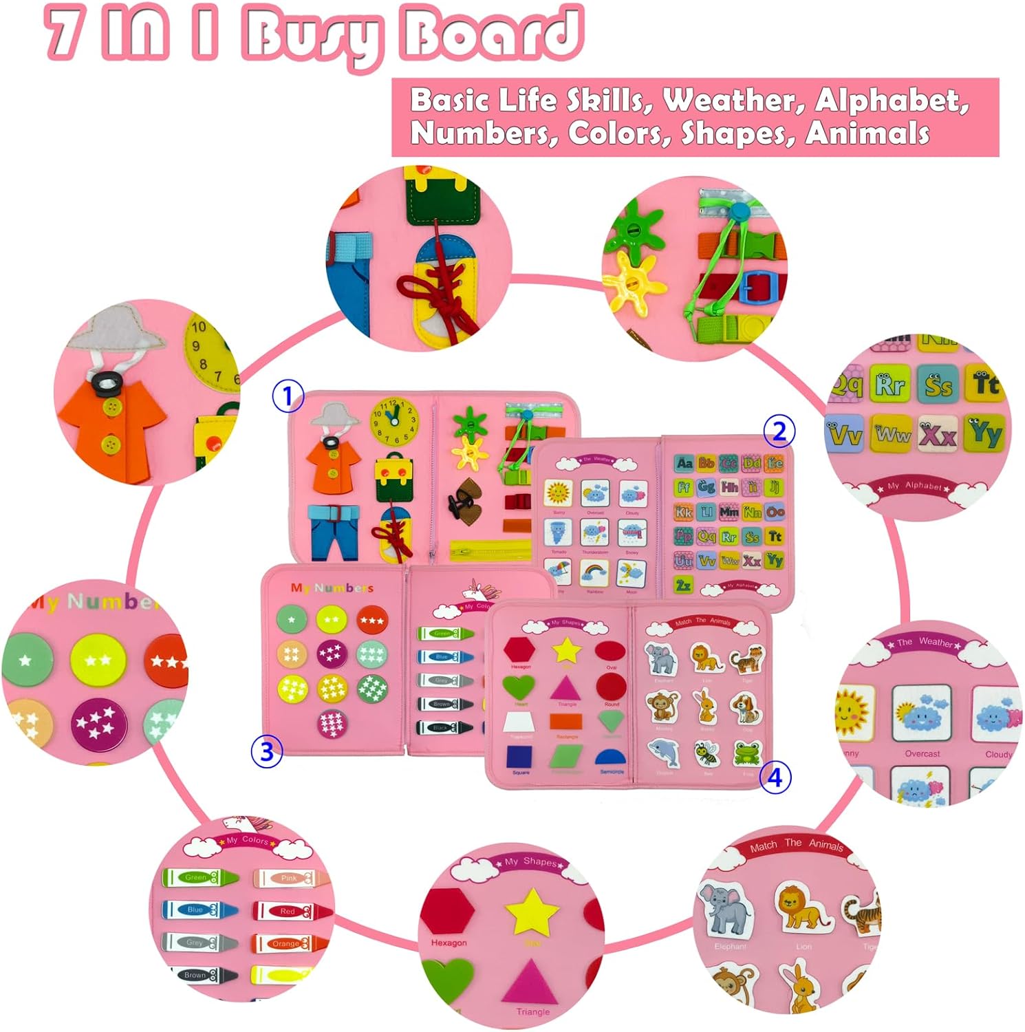 Montessori Busy Board Toys: IVYs.SZ busy board includes 15 basic life skills, 26 letters A-Z, numbers 1-10, 12 shapes, 10 colors, 9 types of weather and 9 animals. Keep your child entertained while learning basic life dressing skills and fine motor skills. Each page is removable for multiple toddlers to play together.