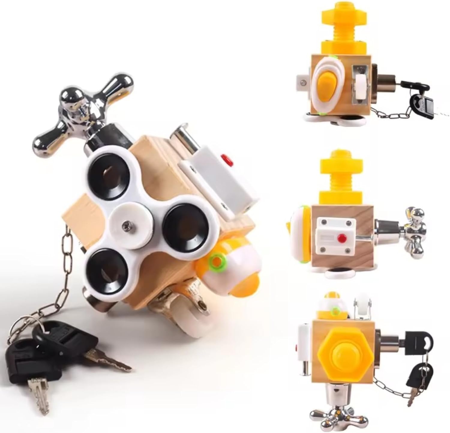 【Montessori Cognitive Toy】This Montessori sensory busy board features 7 different combinations of mechanisms, includes fingertip gyroscope, anti theft safety lock and key, spring bolt, switch, universal wheel, water tap and rotating screw cap.7 sides of play encourage discovery and exploration, Cultivate children’s cognitive, attention and learning ability, Encourage independent thinking and to daily life, to cultivate independent thinking and problem-solving skills in 3 Years and Above babies,helping to develop essential basic skills.