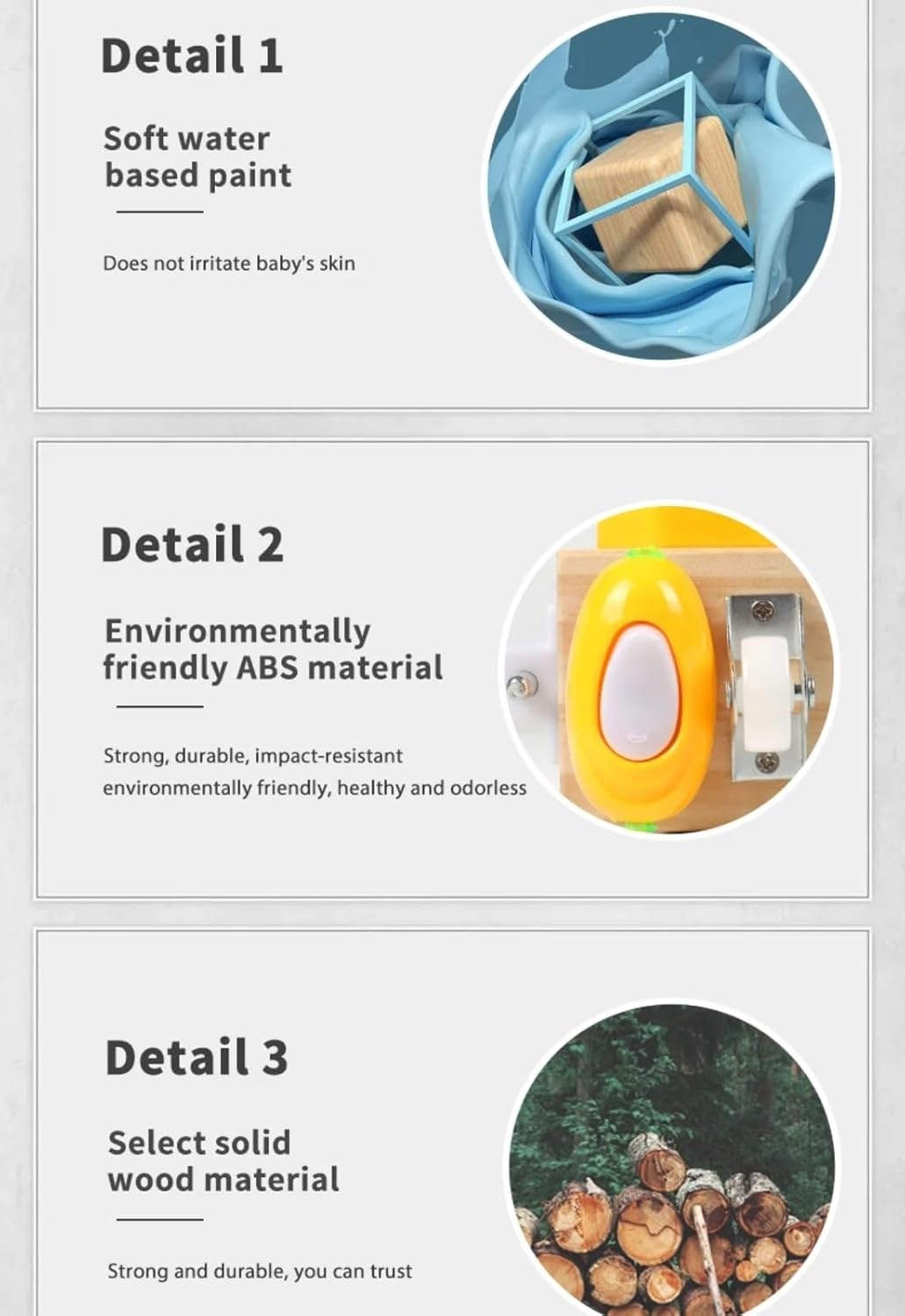 Made from high-quality wood, this busy board is durable and resistant to play and falls, ensuring it can withstand the rough play of curious little ones. The solid wood core material has a clear wood texture and smooth edges and corners without any burrs,