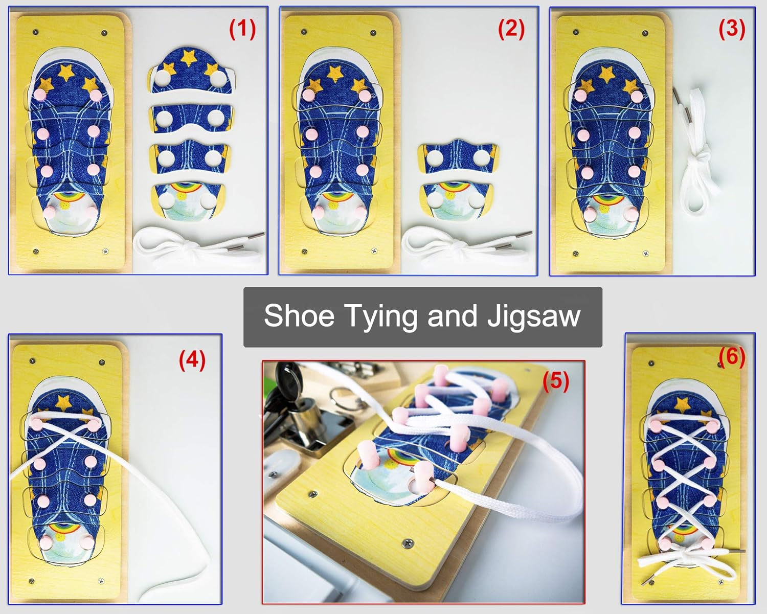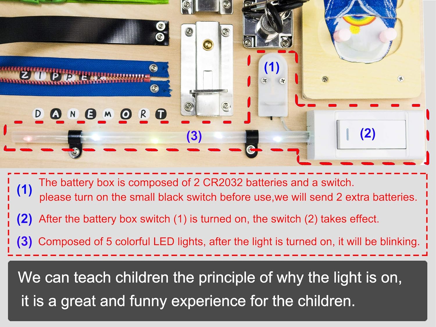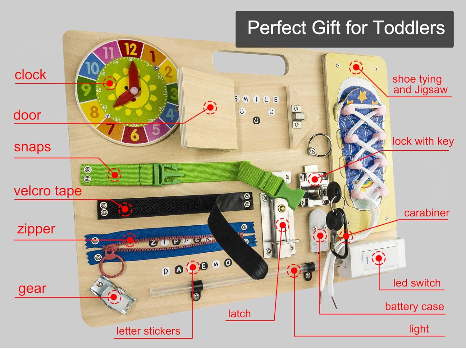 【12-IN-1 ACTIVITY BOARD】 Our learning toy features 12 activity center, including manual door bolt,automatic door bolt,twitching rings, time telling clock,led light switch,lock with key,carabiner, shoe tyingand Jigsaw, zipper, snaps,velcro tape