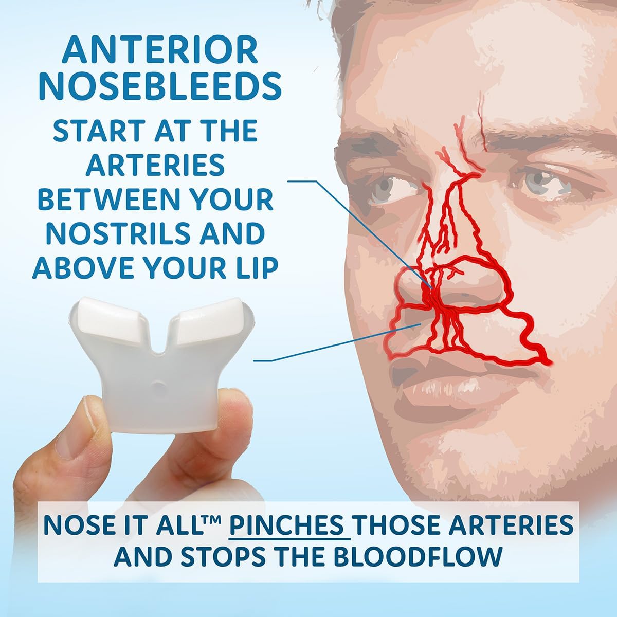 Stops anterior nosebleeds (aka epistaxis) by applying upward pressure to the superior labial artery, a common source of bleeding.