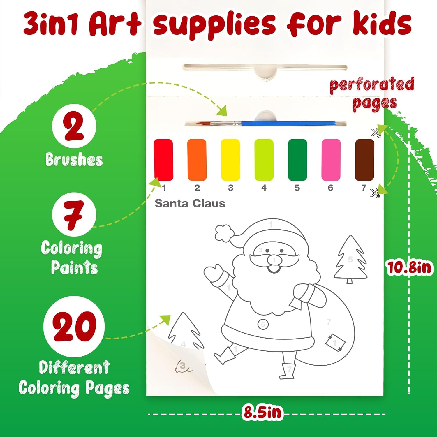 Easy to Use Quality Materials, Art craft watercolor painting book contains 20 coloring sheets,each page has a funny christmas pattern, equipped with two brushes, Each pattern has a corresponding number to guide the coloring to match, which allows children to finish coloring without stress. The paper is thick enough to prevent bleed-through to the next page. The watercolor book pages come with cut lines for easy tearing off