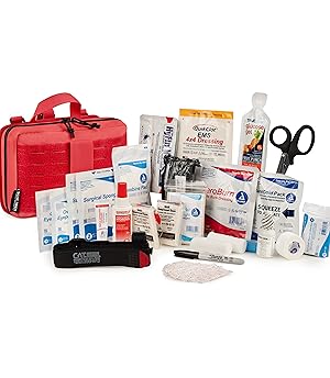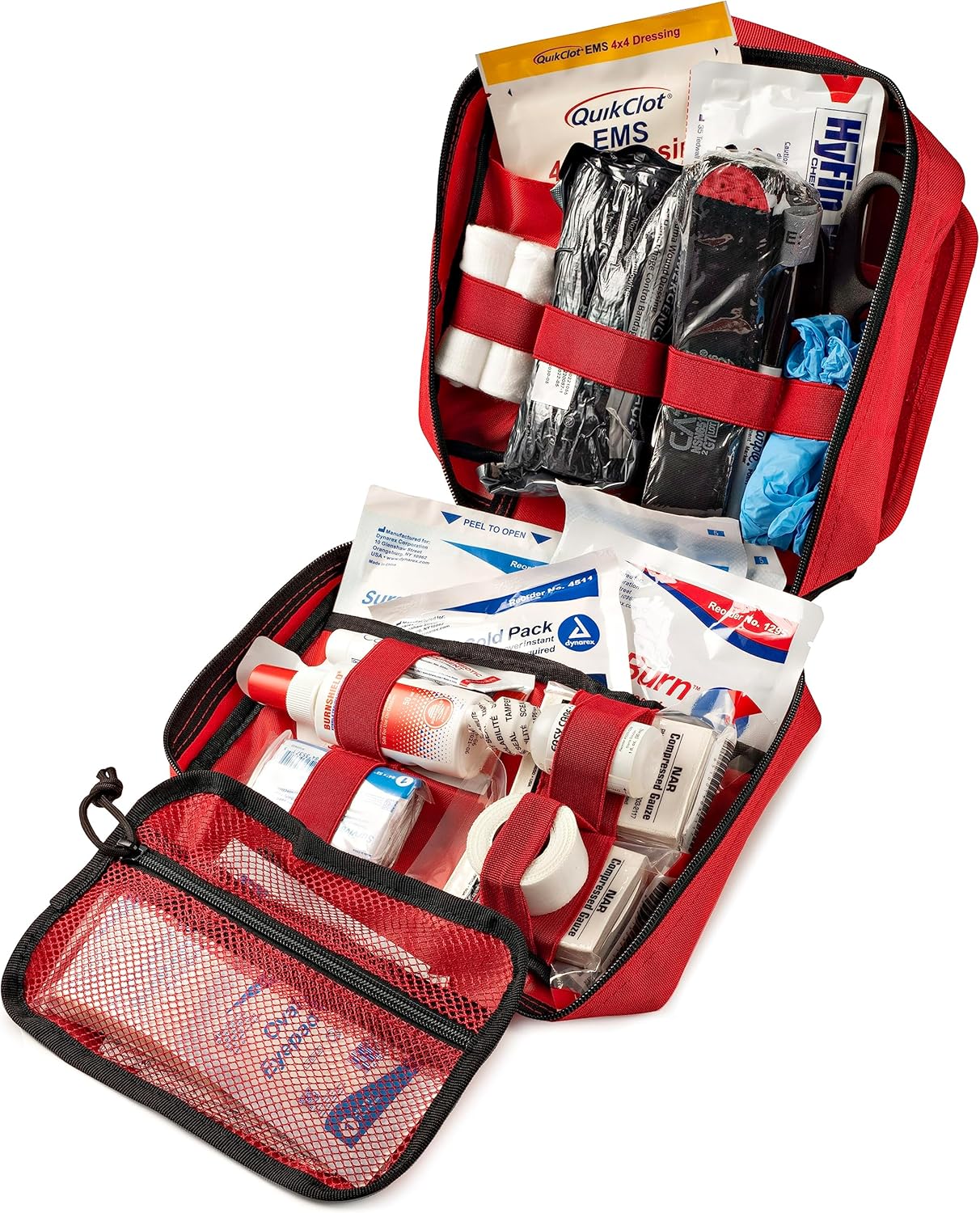 1 x Bandage Shears, 7.5″ ● 20 x Adhesive Bandages 3/4″ x 3″ ● 25 x Gauze Pads 4″x 4″ ● 2 x Stretch Gauze Bandage Roll 3″ ● 2 x Combine Pads 5″ x 9″ ● 1 x Cloth Surgical Tape 1″ x 10 yds ● 1 x Triple Antibiotic Ointment, 0.5 oz tube ● 1 x Instant Cold Pack 4″ x 5″ ● 2 x Oval Eye Pads 1-5/8″ x 2-5/8″ ● 2 x Triangular Bandage, 36″ x 36″ x 51″ ● 1 x Eye Wash 1oz ● 4 x Nitrile Sterile Exam Gloves ● 1 x Finger Splint ● 1 x Glucose Gel, 15g ● 10 x Sting & Bite Pads ● 1 x CPR Rescue Mask ● 1 x Hydrogel Burn Spray 1.8oz ● 1 x Emergency Survival Rescue Blanket 84″ x 52″ ● 1 x First Aid Guide Booklet ● 1 x Burn Dressing, 4″ x 4″ ● 1 x NAR Combat Application Tourniquet Gen 7 ● 1 x NAR Hyfin Vent Chest Seal Twin Pack ● 1 x 6″ Emergency Israeli Bandage ● 2 x NAR Compressed Gauze ● 1 x Permanent Marker ● 6 x BZK Wipes ● 1 x QuikClot EMS 4×4 Dressing