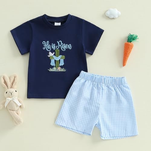 Toddler Baby Boy Easter Outfit Bunny Embroidery Short Sleeve T-shirt Elastic Plaid Shorts 2pcs Infant Summer Set