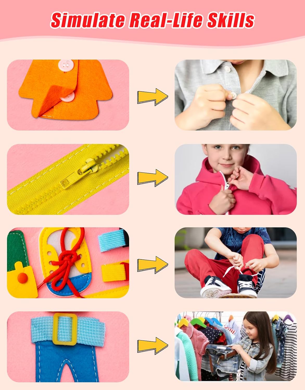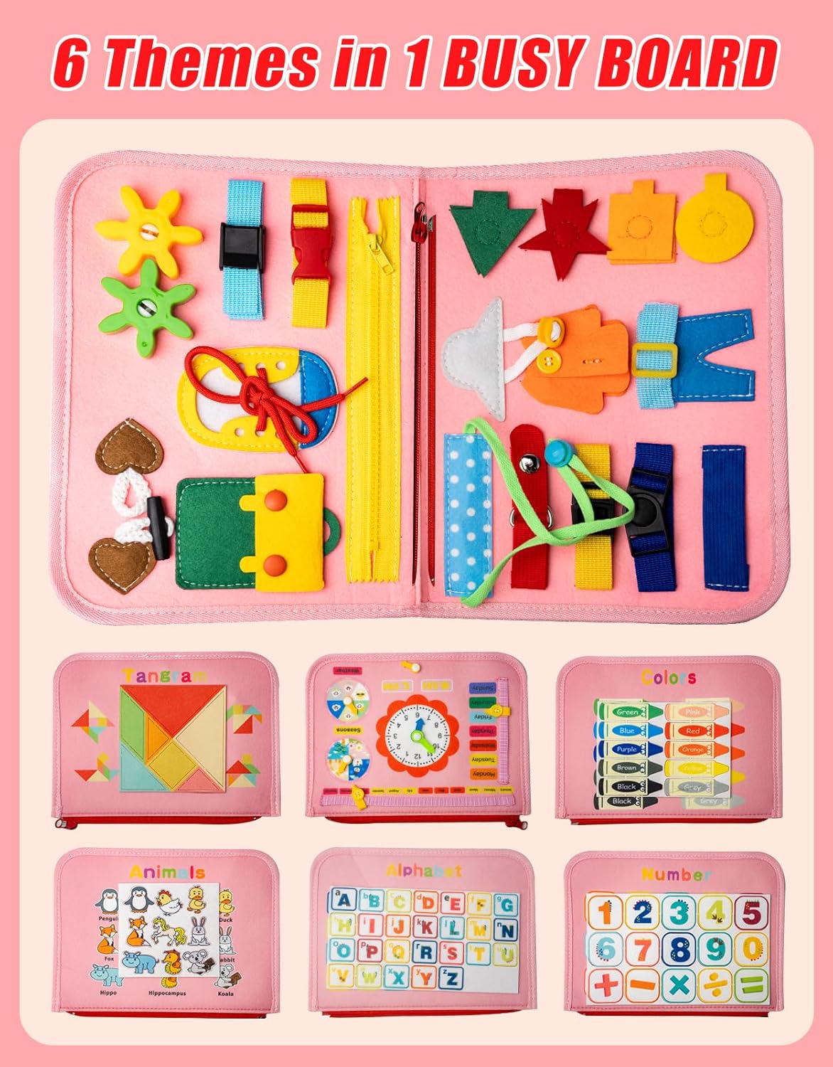 Cute Busy Board: This toddler busy board is a educational toy for 1 2 3 4 years old to learning basic life skills. We offer Montessori boards with different themes, Include life skills, alphabet, numbers, starry sky, weather, animals, colours, dress skills. It can improve children’s flexibility and awareness of food,simulate daily habits