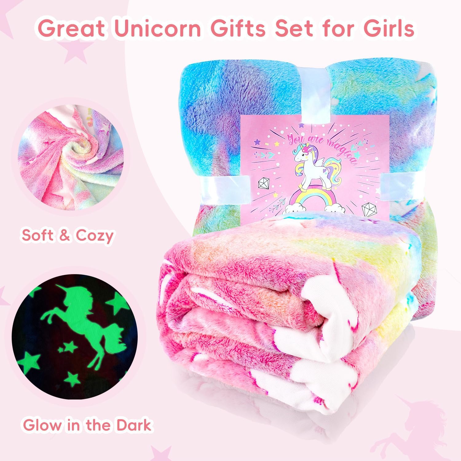 Children Safe Material:This glow in the dark blanket unicorn gifts for girls is made by super soft and high quality fabric, cozy, warm, skin-friendly and breathable. Adopted safe printing process, Safe for Children to use without hurting their delicate skin.