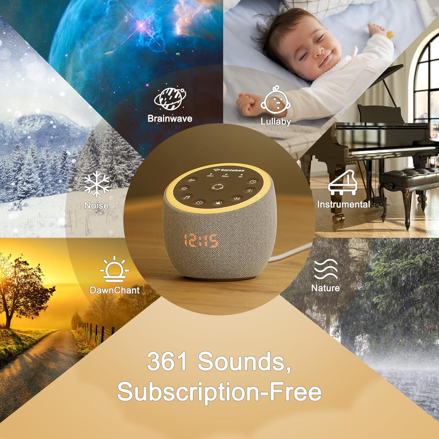 𝟑𝟔𝟏 𝐒𝐨𝐨𝐭𝐡𝐢𝐧𝐠 𝐒𝐨𝐮𝐧𝐝𝐬, 𝐒𝐮𝐛𝐬𝐜𝐫𝐢𝐩𝐭𝐢𝐨𝐧-𝐅𝐫𝐞𝐞 – Block out distractions with 361 soothing sounds in APP, including white noises, pink noises, brown noises, green noises, soothing melodies, nature-inspired sleep sounds etc, all backed by science for better rest