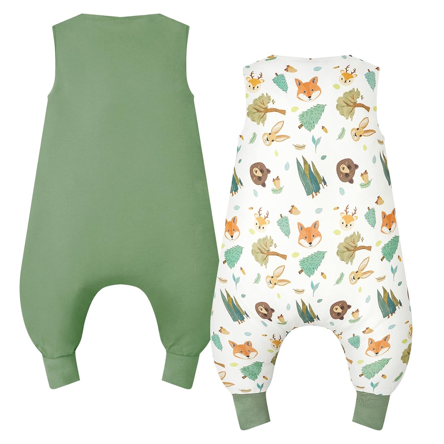 2 Pack Sleeveless baby sleep sack: 1.0 TOG baby sleeping bag with legs offers the best thermal resistance and is ideal for room temperatures between 20-24°C. It is suitable for spring, summer and fall. The baby sleep sack can be worn on its own or with pyjamas.